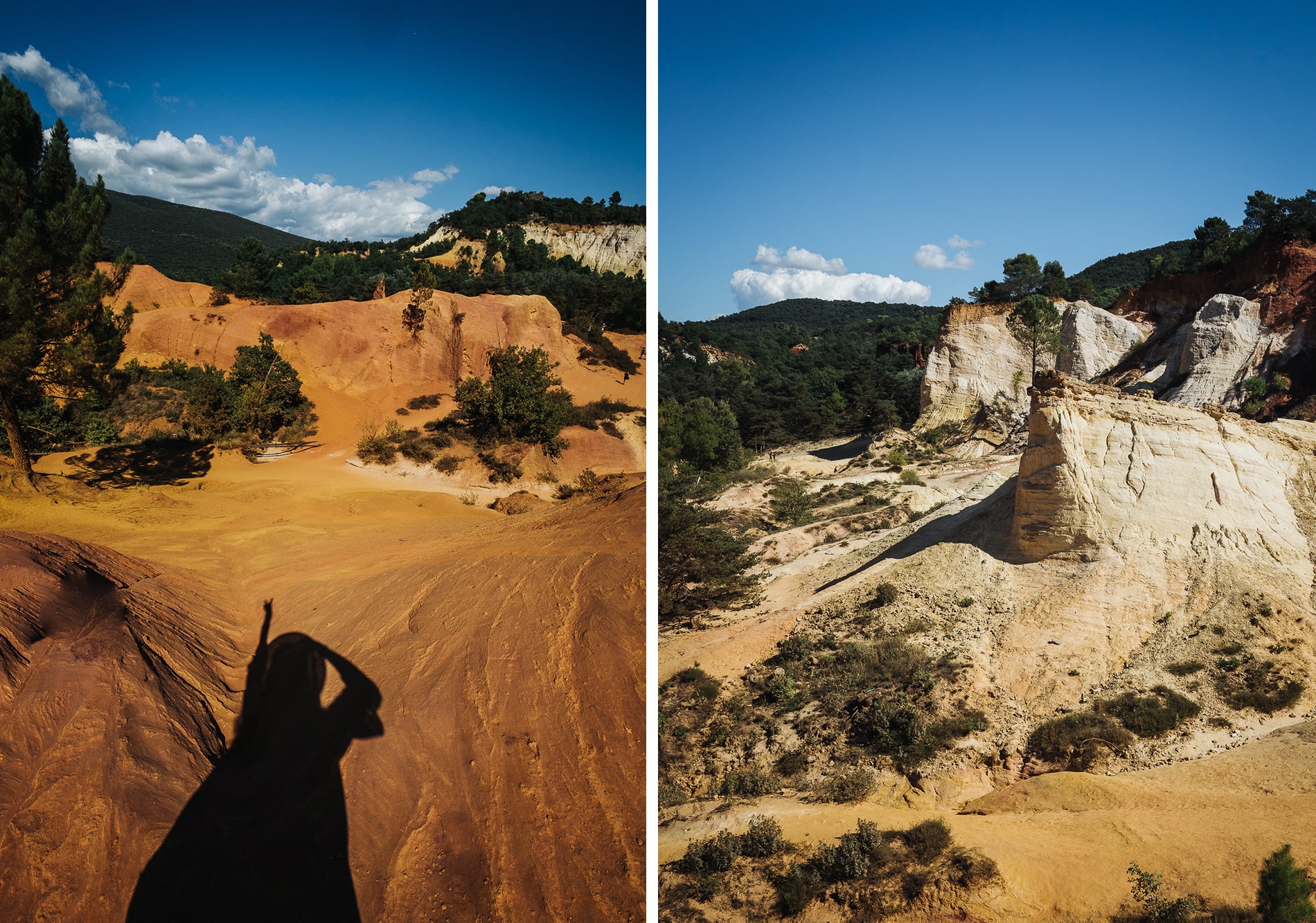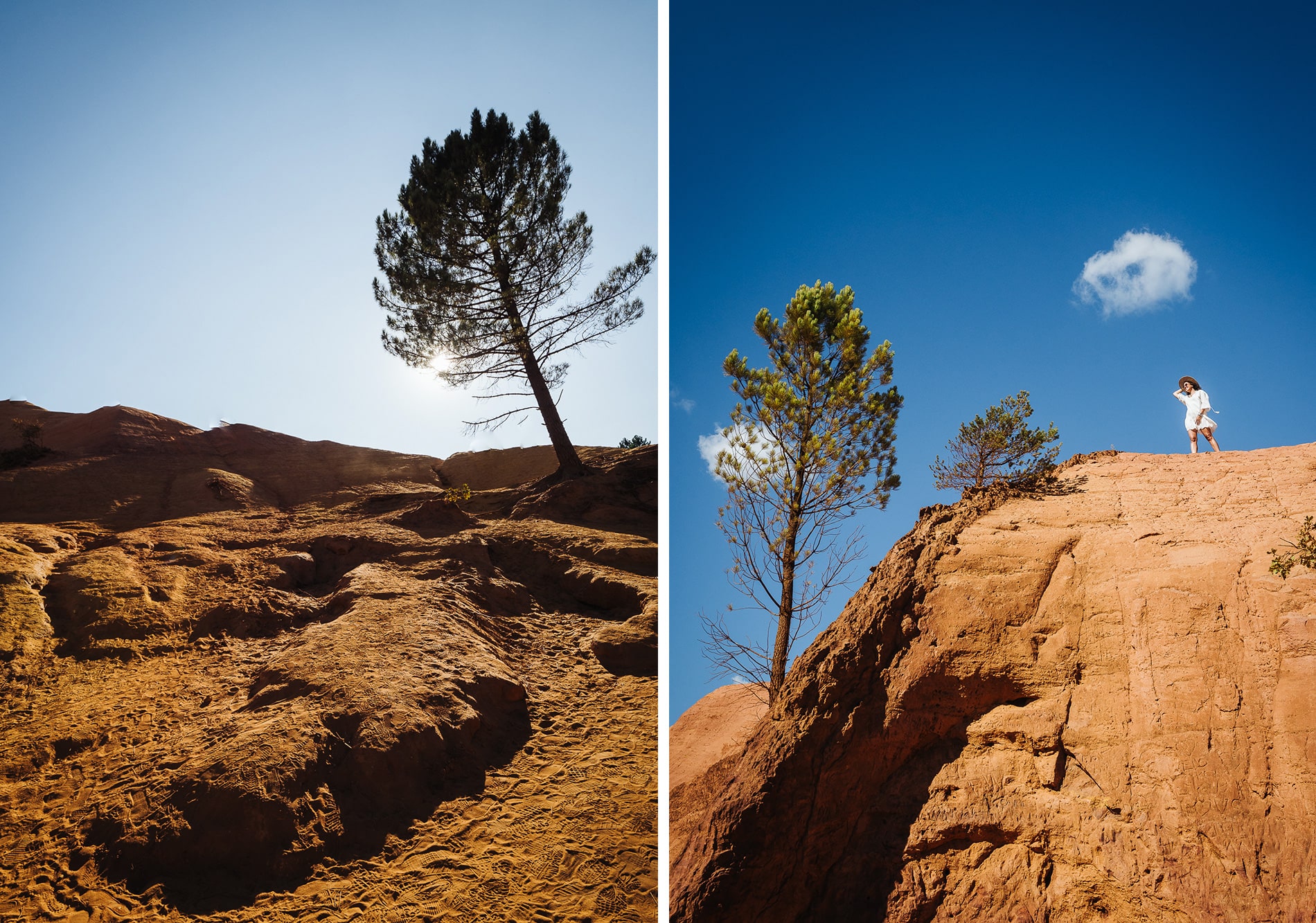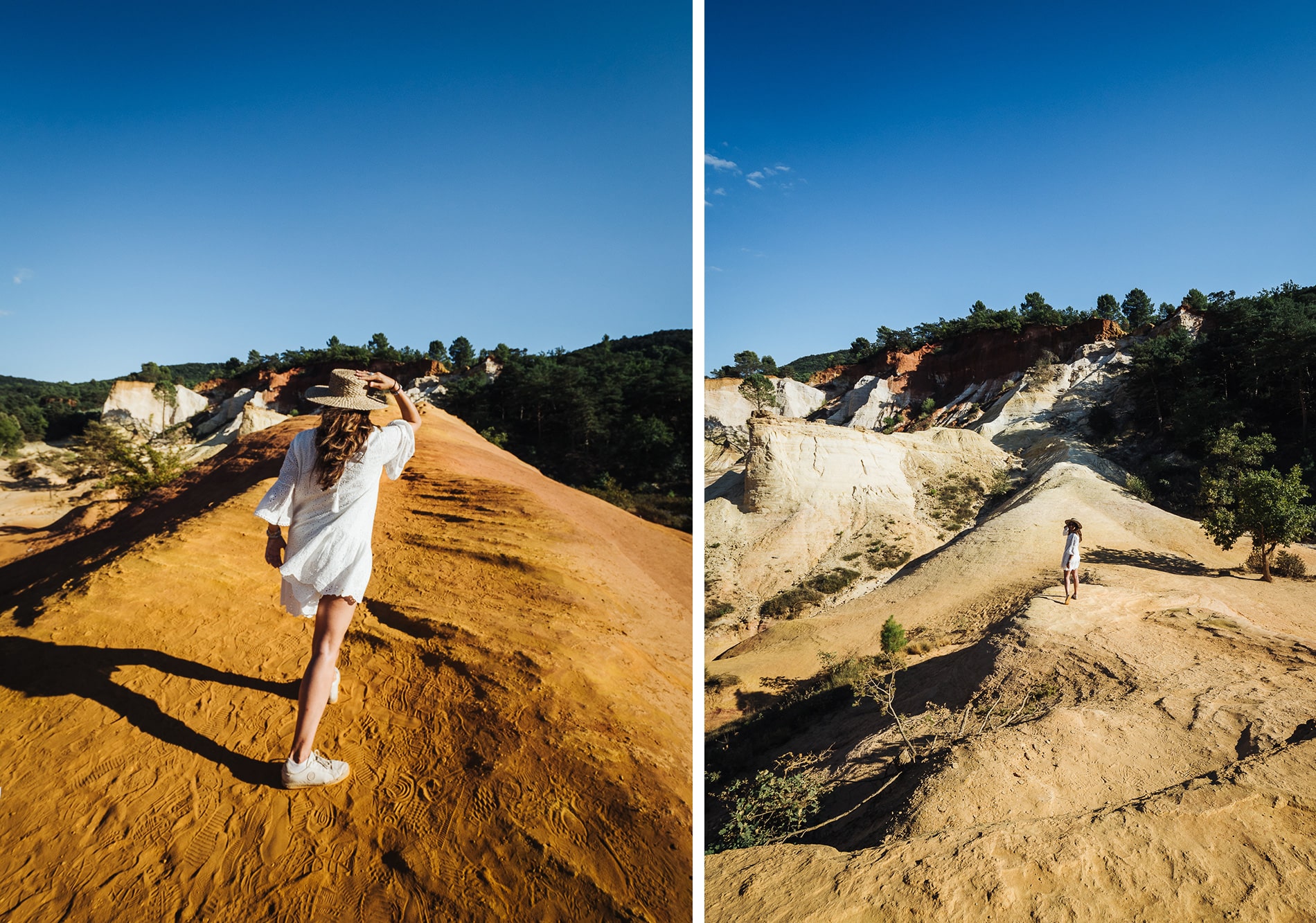 Depuis le parking, comptez environ 15 minutes de marche pour arriver sur le site principal les « cheminées des fées » qui pour nous, étaient le plus bel endroit. On a vraiment pris le temps de photographier chaque petit recoin, et de nous amuser avec les angles, les ombres, les perspectives. Les couleurs du coucher du soleil étaient juste incroyables… Nous avons cru parfois à certaines moment, que nous étions dans le bush en Namibie. Le Colorado Provençal est un beau terrain de jouer pour vous perfectionner en photos!