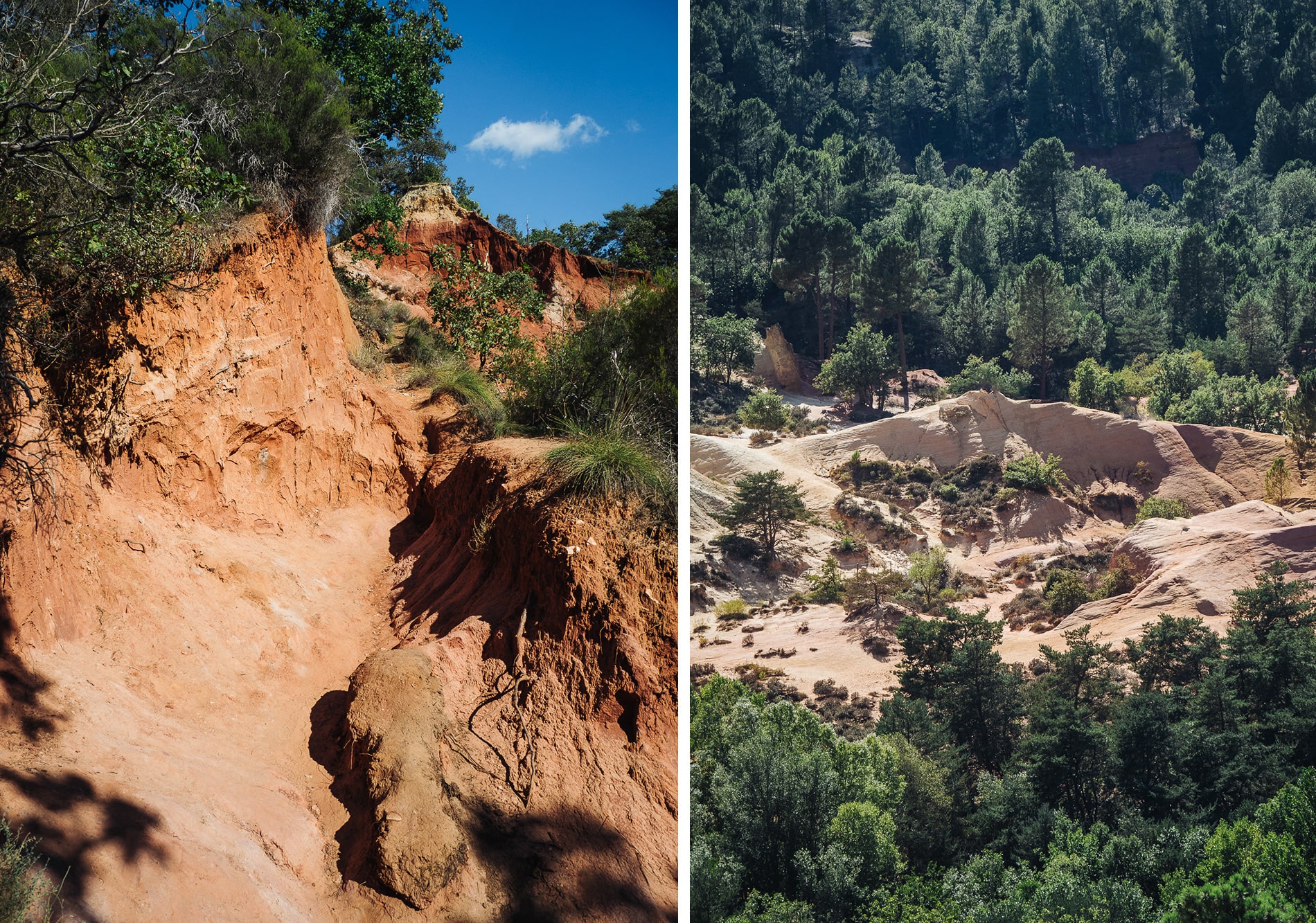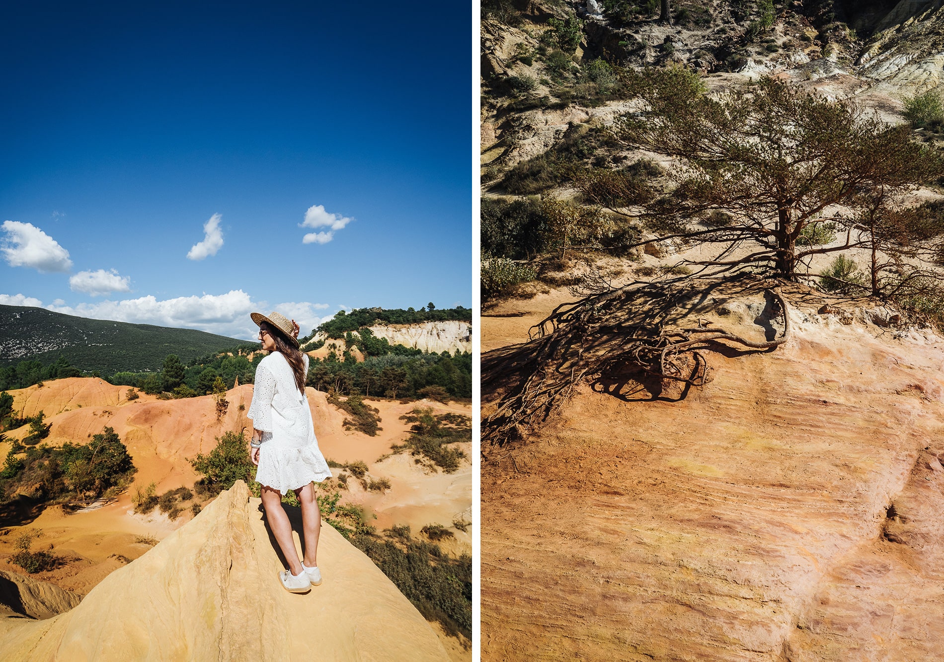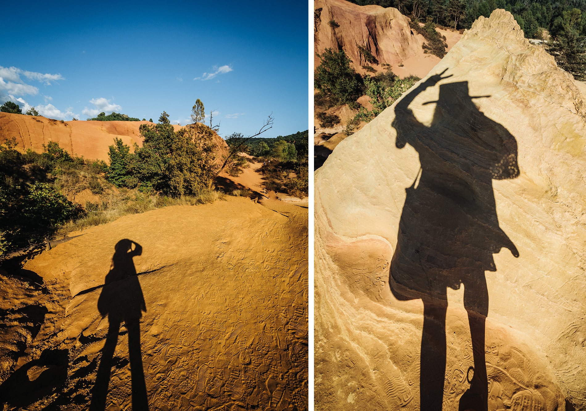 Depuis le parking, comptez environ 15 minutes de marche pour arriver sur le site principal les « cheminées des fées » qui pour nous, étaient le plus bel endroit. On a vraiment pris le temps de photographier chaque petit recoin, et de nous amuser avec les angles, les ombres, les perspectives. Les couleurs du coucher du soleil étaient juste incroyables… Nous avons cru parfois à certaines moment, que nous étions dans le bush en Namibie. Le Colorado Provençal est un beau terrain de jouer pour vous perfectionner en photos!