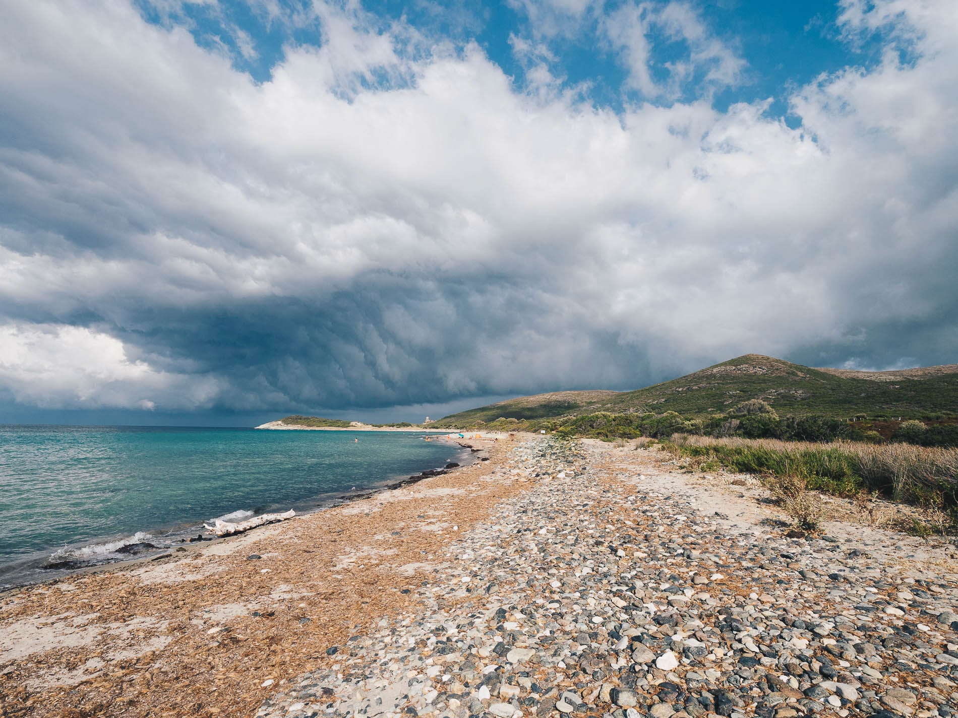 Nous y avons passé toute l’après midi à Nonza et sommes rentrés en début de soirée sur Erbalunga. Nous voulions profiter des lumières de fin d’après-midi qui accentuent le contraste du coucher de soleil de l’autre côté de la plage. Les lueurs sont belles et il n’y a vraiment personne. Vous avez le sentiment d’être seul au monde.