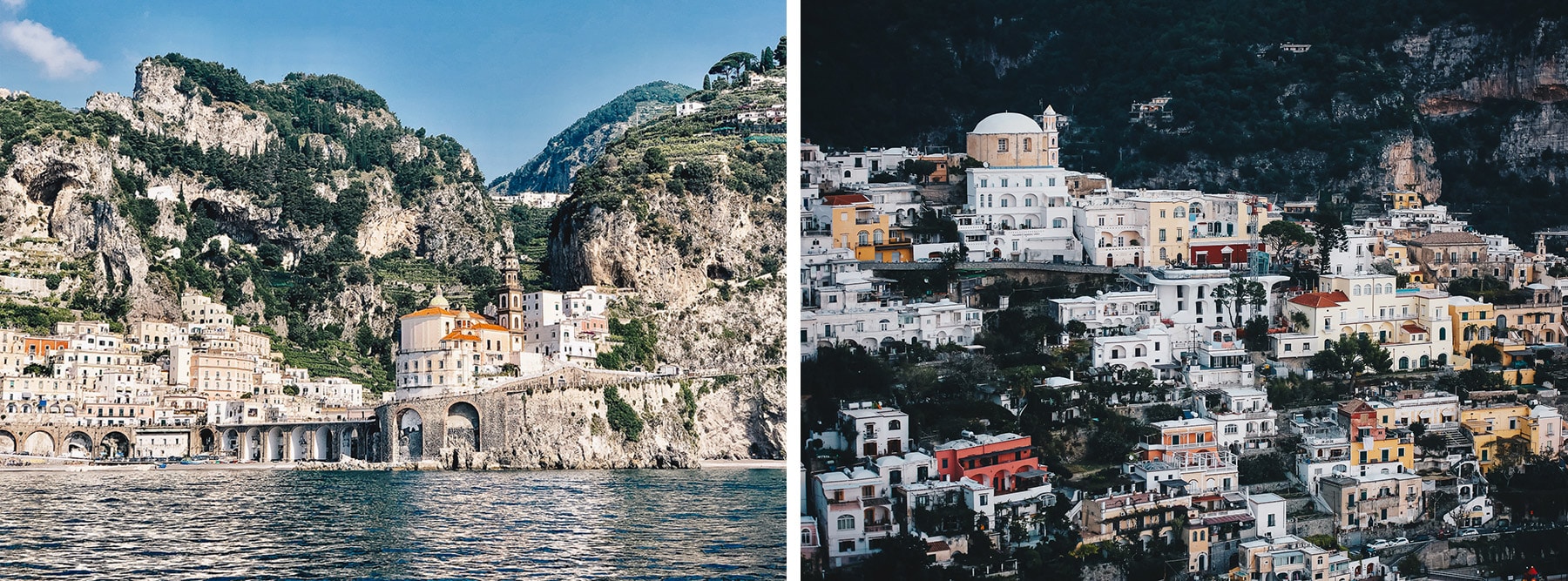 La côte Amalfitaine, c’est la Dolce Vita à l’italienne. Vous trouverez de très belles églises, de beaux villages perchés, de bons restaurants, mais également de nombreux panoramas à flanc de falaise. Parmi les villages incontournables de la Côte Amalfitaine, Positano reste sans conteste le village carte postale par excellence. Ses maisons pastel empilées sur les falaises, ses ruelles bordées de bougainvilliers, ses boutiques d’artisans et son église Santa Maria Assunta avec son majestueux dome majolique en font un lieu féérique il fait bon flâner, appareil photo à la main. À quelques kilomètres, Amalfi vous plonge dans une atmosphère plus médiévale, avec sa somptueuse cathédrale arabo-normande et ses petites places animées où s’arrêter boire un café.