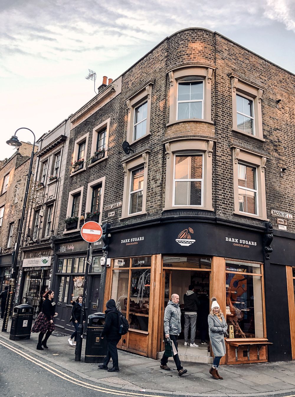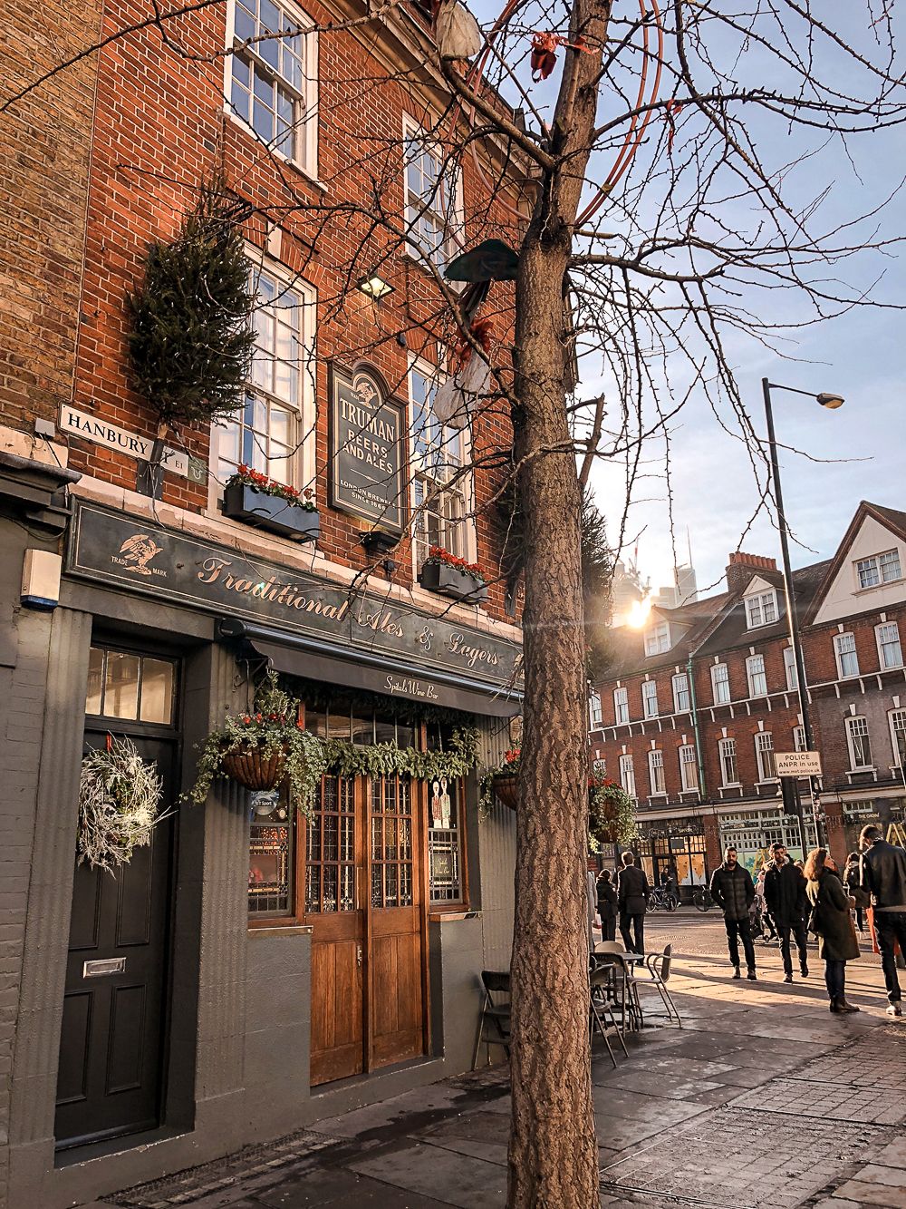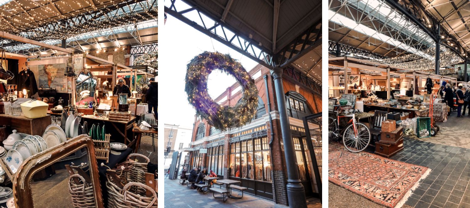 On trouve encore du street art au coin Hanbury Street et Wilkes Street mais aussi sur Grey Eagle Street. la boutique Adidas où nous avons déniché une paire de baskets exclusive et vendue uniquement à Londres. Si vous ne connaissez la boutique All Saints (114 commercial street ), arrêtez-vous juste pour le plaisir des yeux et faites une pause déjeuner chez un classique de la cuisine anglaise, le fish & chips de chez Poppies fish & chips. Un beau petit restaurant et un bon fish & chips qui a l’avantage d’être plus généreux en poisson qu’en chapelure garnie d’huile. Prenez ensuite à gauche sur commercial street puis à droite sur Brushfield street où vous aurez un beau point de vue sur l’église de Christ Church Spitafields et son clocher blanc puis sur la gare de Liverpool Street à l’autre bout de la rue. Ne manquez pas non plus d’aller faire un tour dans la boutique « Anthropologie » avant d’aller flâner dans les travées du Old Spitafields Market, un autre coup de cœur. Ce marché couvert symbolique du quartier, se trouve dans une ancienne bâtisse Victorienne, autrefois dédié à un marché aux soies. Aujourd’hui, sous ces halles restaurées se trouvent des brocanteurs, des cafés, stands de disques, de jolies boutiques et un choix énorme de street food, plus gourmands les uns que les autres. Durant les fêtes de Noël, il est possible d’y acheter les fameux Jump Pull, ces pull moches de Noël mais qu’on adore tant! C’est assez fou de voir que tous les anglais raffolent de cette tradition en organisant des « Ugly Christmas Sweater Party« , une petite fête où directeurs et employés viennent en tenue extravagante. Métro Liverpool Street Station.