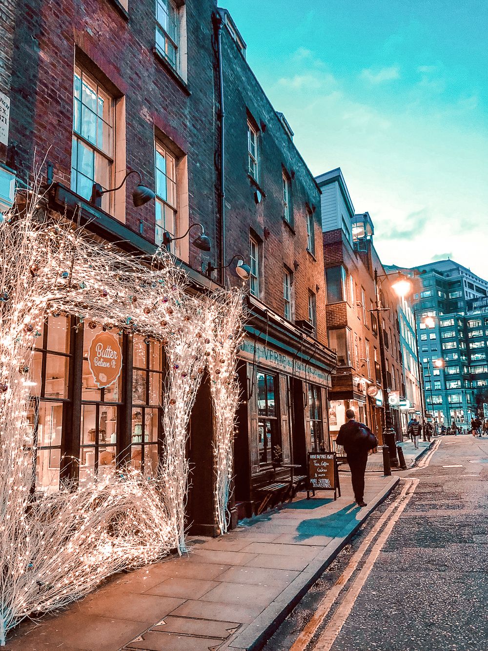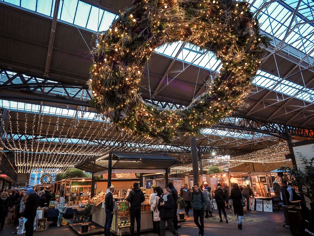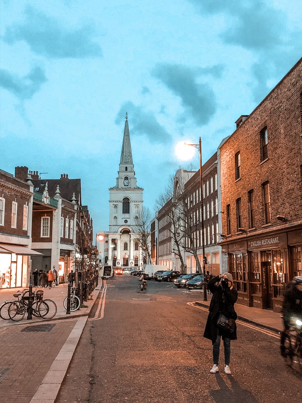 On trouve encore du street art au coin Hanbury Street et Wilkes Street mais aussi sur Grey Eagle Street. la boutique Adidas où nous avons déniché une paire de baskets exclusive et vendue uniquement à Londres. Si vous ne connaissez la boutique All Saints (114 commercial street ), arrêtez-vous juste pour le plaisir des yeux et faites une pause déjeuner chez un classique de la cuisine anglaise, le fish & chips de chez Poppies fish & chips. Un beau petit restaurant et un bon fish & chips qui a l’avantage d’être plus généreux en poisson qu’en chapelure garnie d’huile. Prenez ensuite à gauche sur commercial street puis à droite sur Brushfield street où vous aurez un beau point de vue sur l’église de Christ Church Spitafields et son clocher blanc puis sur la gare de Liverpool Street à l’autre bout de la rue. Ne manquez pas non plus d’aller faire un tour dans la boutique « Anthropologie » avant d’aller flâner dans les travées du Old Spitafields Market, un autre coup de cœur. Ce marché couvert symbolique du quartier, se trouve dans une ancienne bâtisse Victorienne, autrefois dédié à un marché aux soies. Aujourd’hui, sous ces halles restaurées se trouvent des brocanteurs, des cafés, stands de disques, de jolies boutiques et un choix énorme de street food, plus gourmands les uns que les autres. Durant les fêtes de Noël, il est possible d’y acheter les fameux Jump Pull, ces pull moches de Noël mais qu’on adore tant! C’est assez fou de voir que tous les anglais raffolent de cette tradition en organisant des « Ugly Christmas Sweater Party« , une petite fête où directeurs et employés viennent en tenue extravagante. Métro Liverpool Street Station.