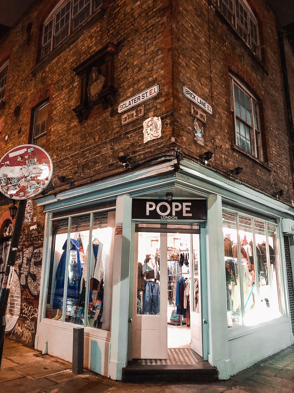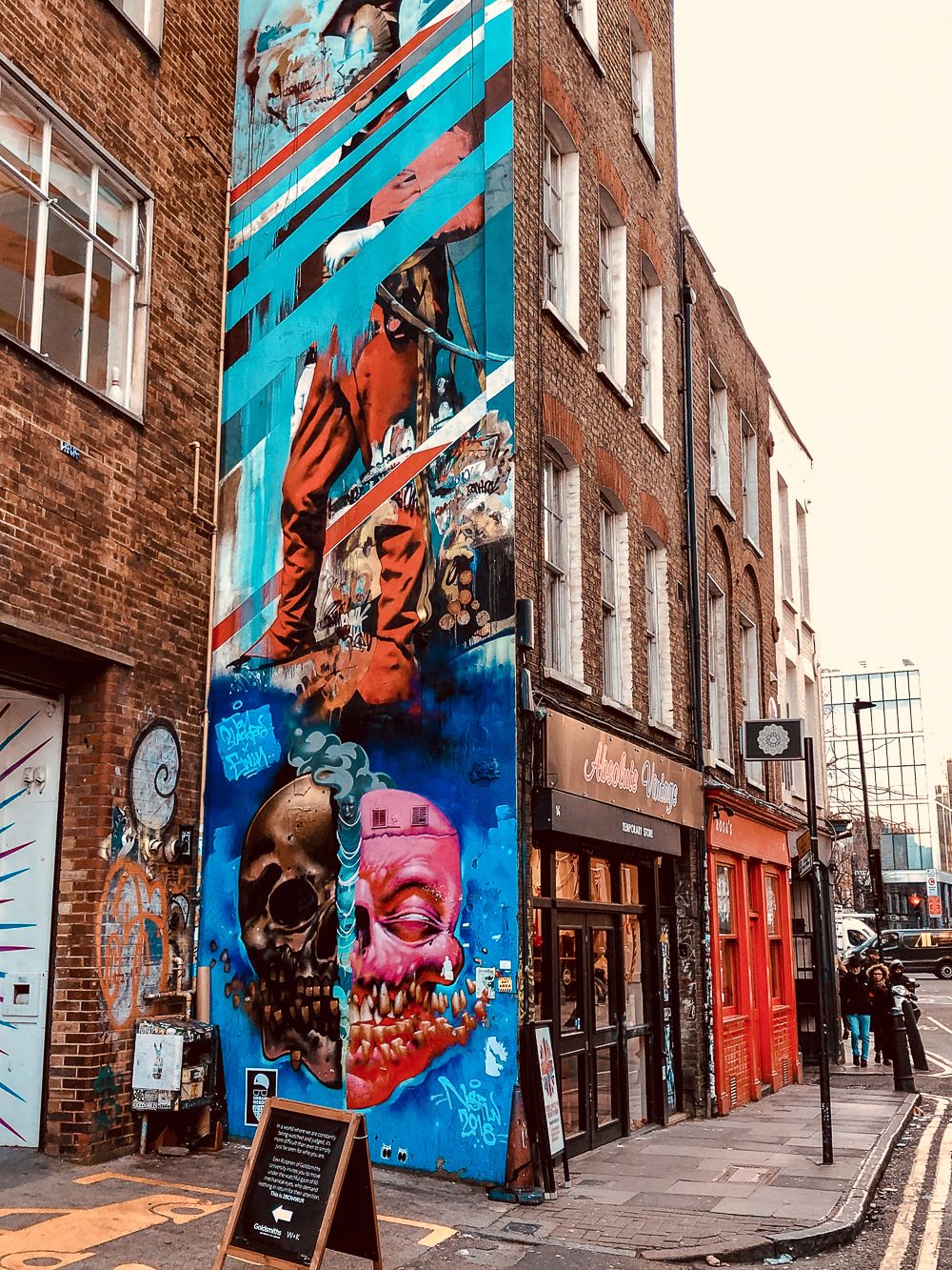 Cette rue qui est facilement reconnaissable par ses briques et son emblème, la longue cheminée en briques rouges (qui abrite une ancienne brasserie Truman Brewery), est notre chouchou et un immanquable d’East London. La rue de Brick Lane est surnommé Banglatown en raison de la forte présence d’habitants du Bangladesh. Selon les jours, vous trouverez un peu partout des stands de street-food. Les anglais ont intégré à leur cuisine de rue des épices, influencée par leur immigration Indienne et ce n’est pas nous déplaire. Soyez donc prêts à manger une cuisine épicée ou des plats au curry. On vient également flâner ici pour les nombreux Coffee Shop, les librairies et les boutiques de décoration. On apprécie également les friperies du quartier comme le vintage shop « Here After« car c’est effectivement un des intérêts de Brick Lane, retravailler sa garde robe! Ne manquez pas la grande friperie du Vintage Market au sous-sol, c’est juste incroyable et gigantesque! C’est dans ce marché que j’ai déniché quelques pépites! Le fameux Brick Lane Market ou Sunday UpMarket, est le rendez-vous incontournable d’East London avec ses pièces uniques mais il est aussi pris d’assaut le dimanche de 9h à 17h.
