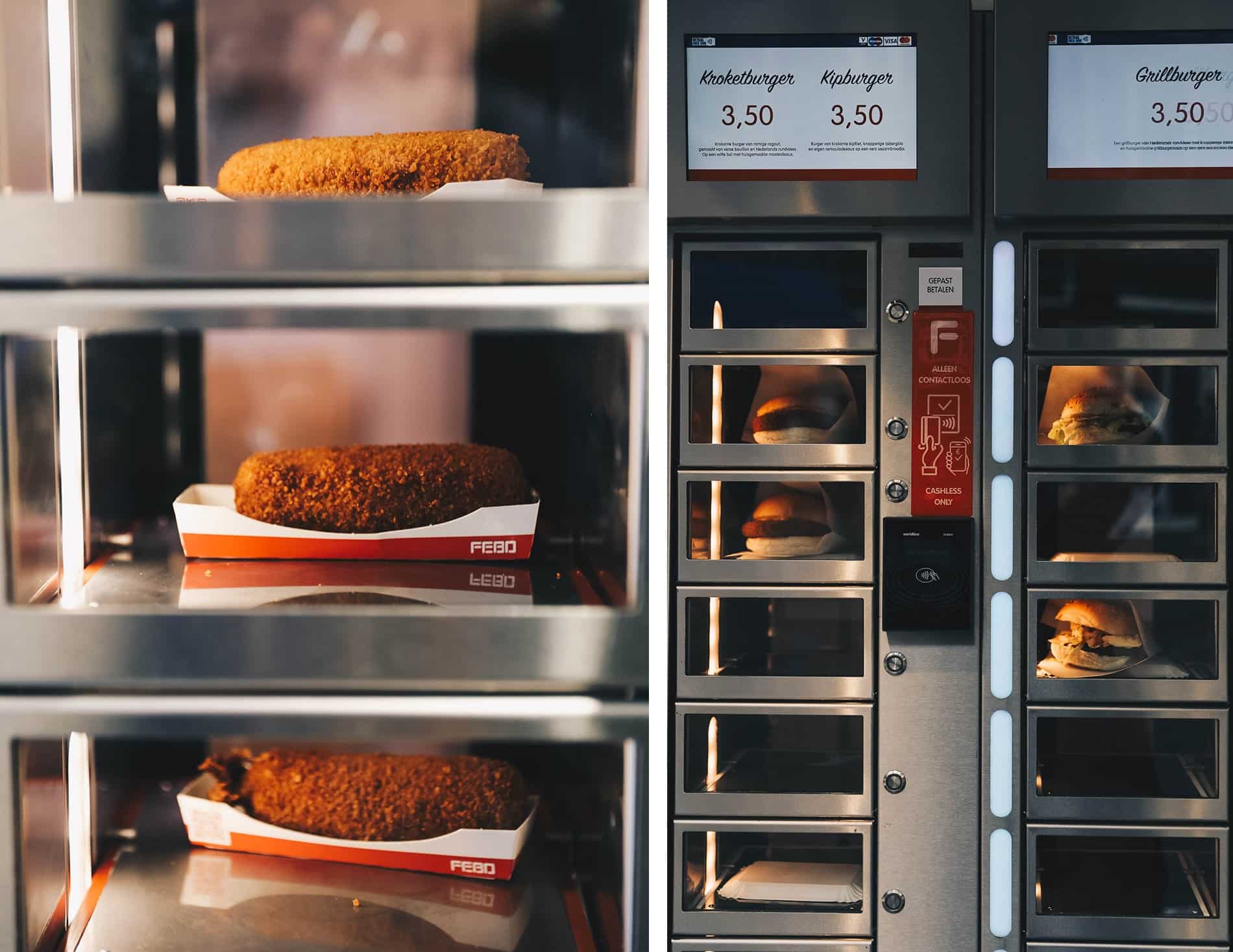 Vous trouverez dans la ville des distributeurs automatiques, les FEBO, où vous pourrez commander une multitude de snacks chaud présentés derrière des vitres en verre, tels que des hamburgers, des saucisses, etc. Le principe est très simple: vous insérez des pièces dans le trou et tout comme un distributeur, la marchandise vous est livré.
