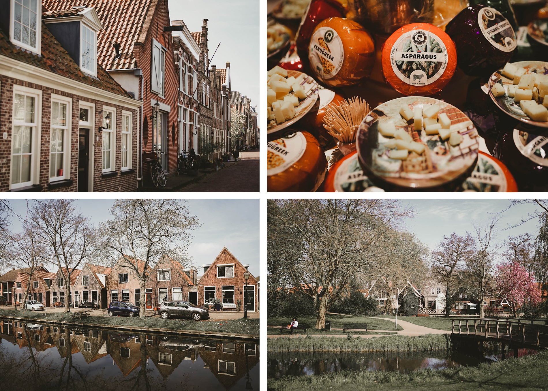 Nous avons commencé par Edam, autrefois un port très fréquenté par les marchands de fromage et de bois. Ce village authentique hollandais, situé au bord du lac de l’IJssel et à 10 minutes de bus de Volendam, est célèbre pour son fromage. Il est donc fortement recommandé de vous arrêter dans la fromagerie Kaasspeciaalzaak Henri Willig pour goûter à l’Edam mais aussi au gouda. Ils vendent une variété de saveurs incroyables comme le gouda à l’asperge et à la noix de coco, une véritable découverte. Mention spéciale pour le gouda fumé ou épicé, un pur délice pour les papilles ! Le fromage est fabriqué localement, à quelques kilomètres du village donc pensez à en ramener dans votre valise. L’ambiance de ce village est différente de Volendam et de Marken. Ici pas de littoral ni d’air marin, mais un joli canal qui traverse le village, bordé de chaque côté par de belles maisons typiques colorées. C’est une atmosphère vraiment paisible où vous aimerez flâner à pied ou a vélo. Si vous souhaitez boire un coup ou déjeuner, posez-vous au DamHotel en plein centre d’Edam. La cuisine est bonne est l’emplacement idéal.