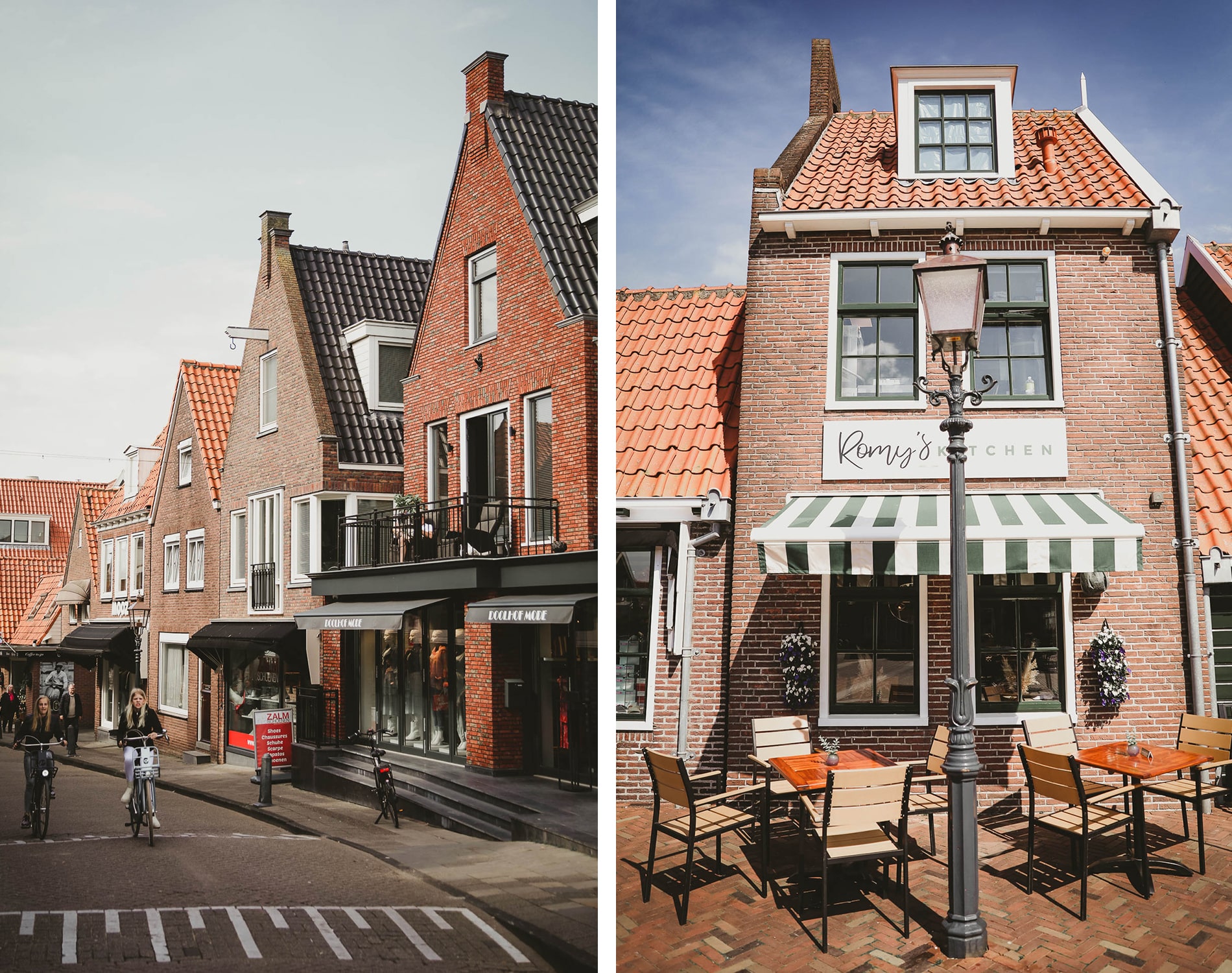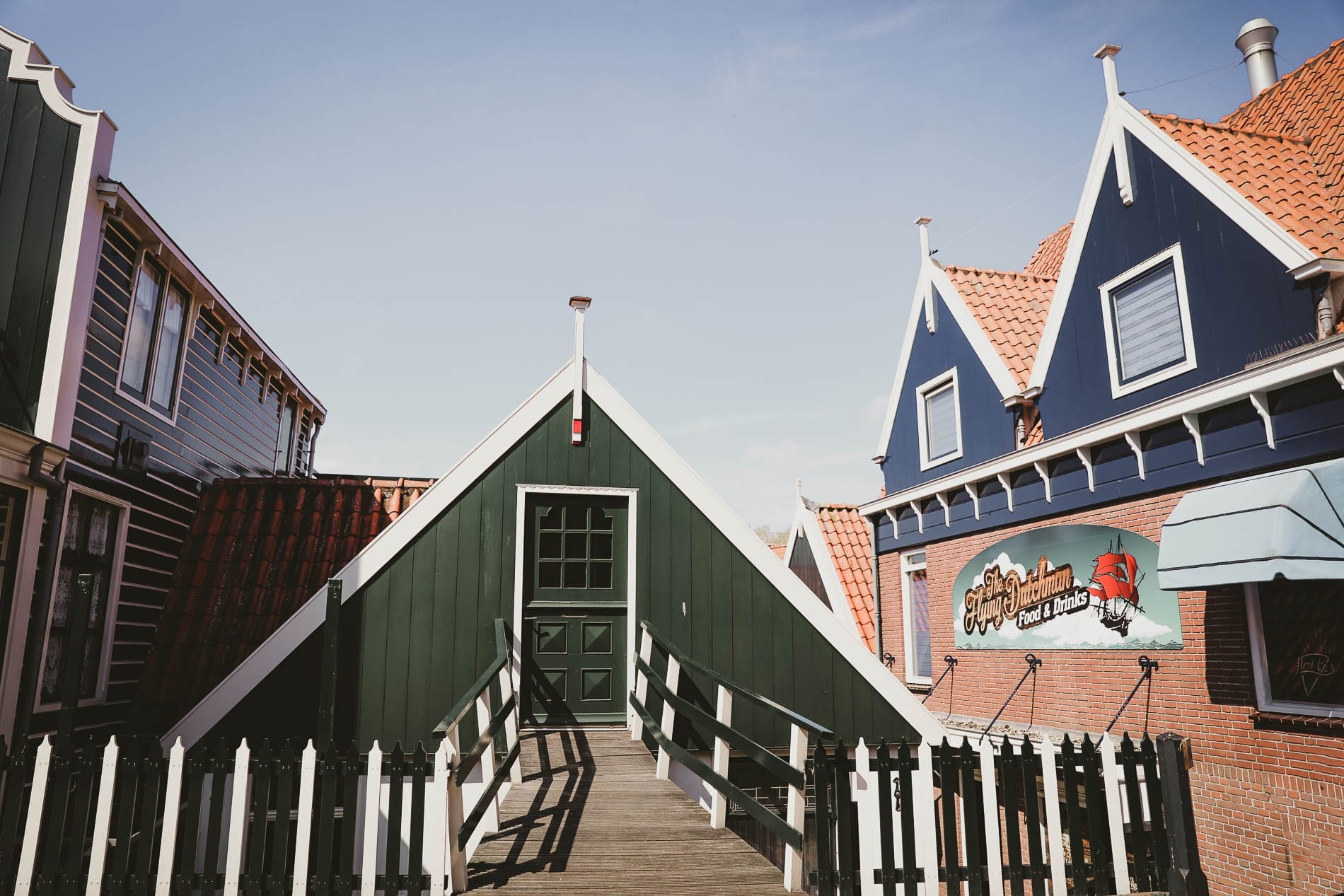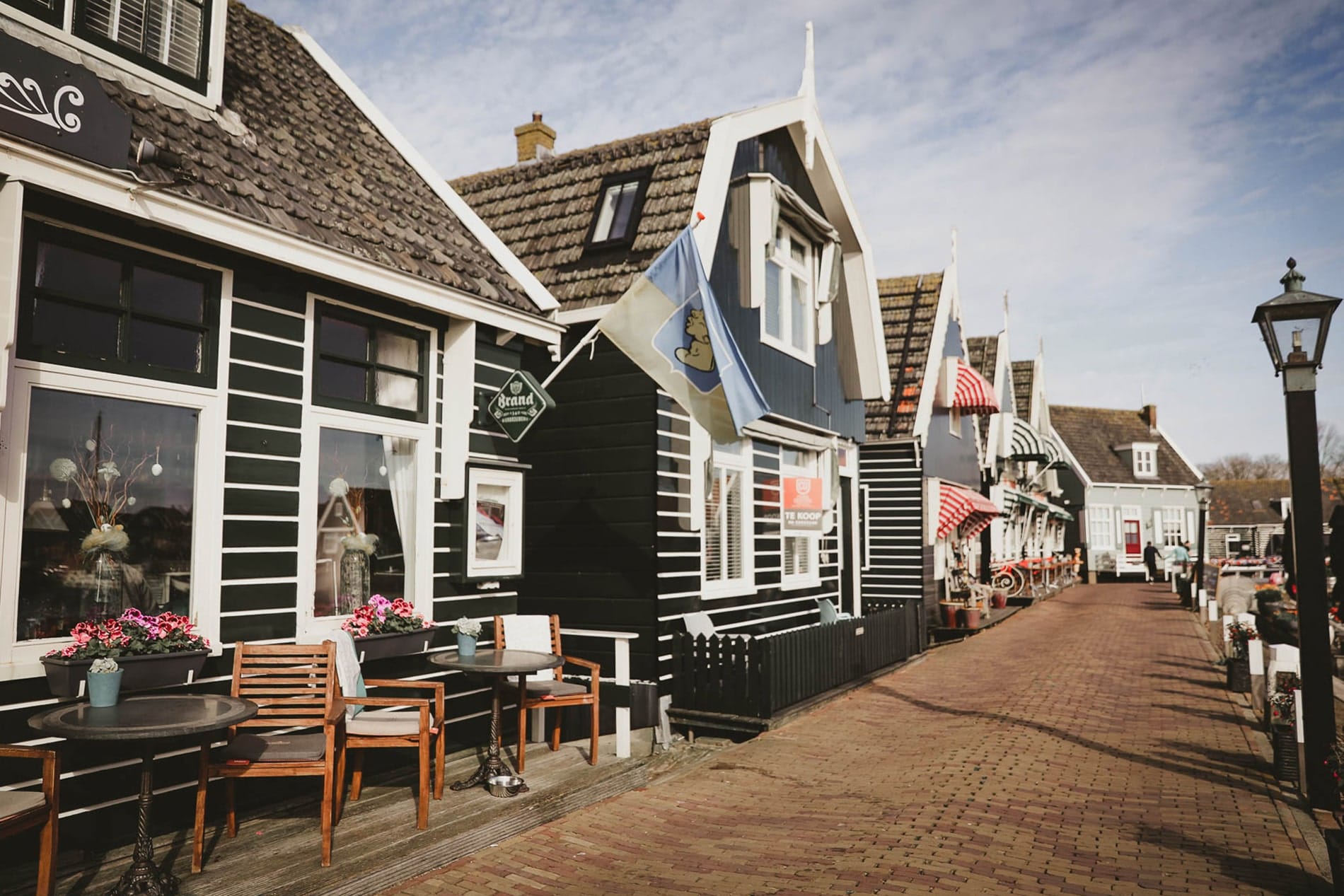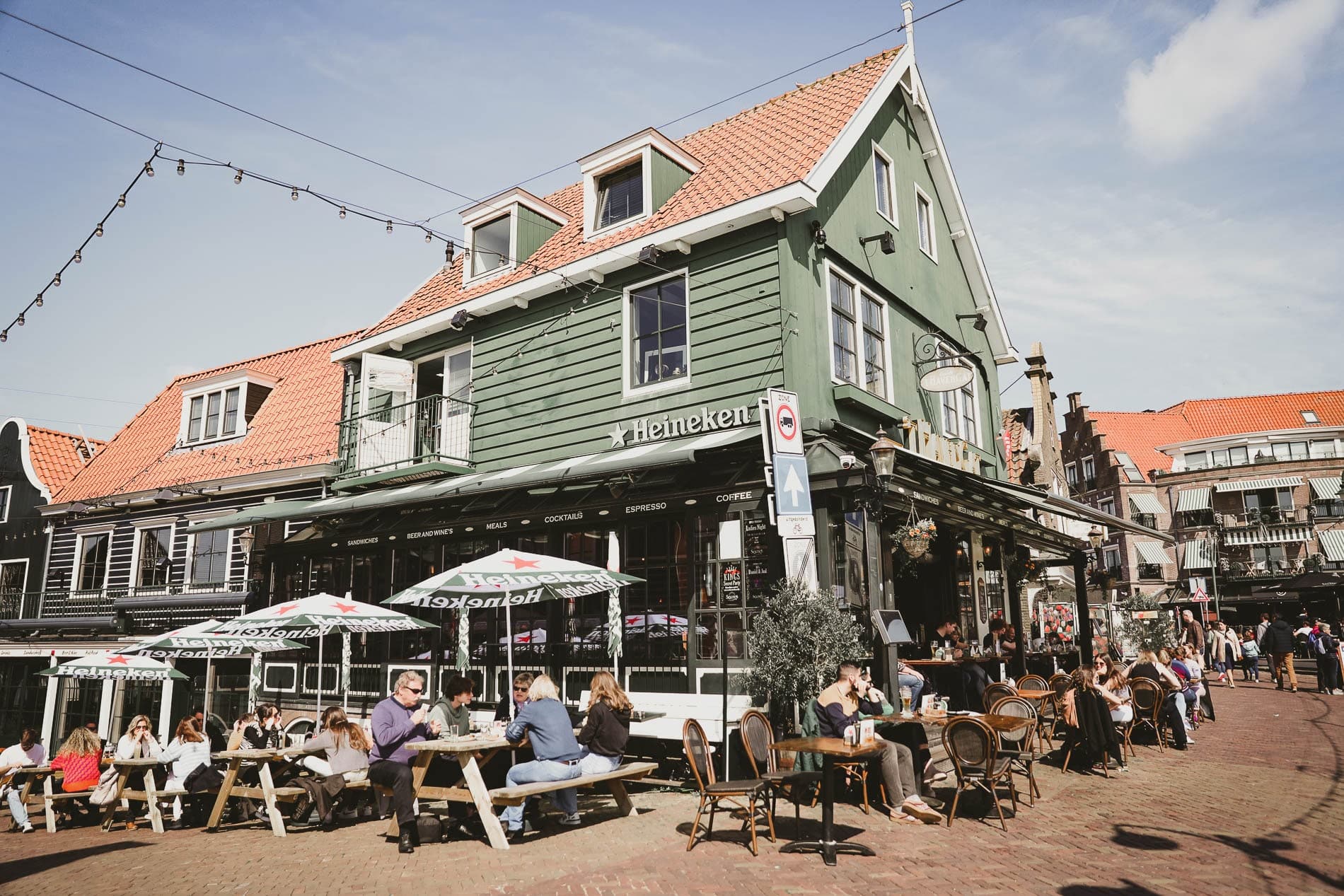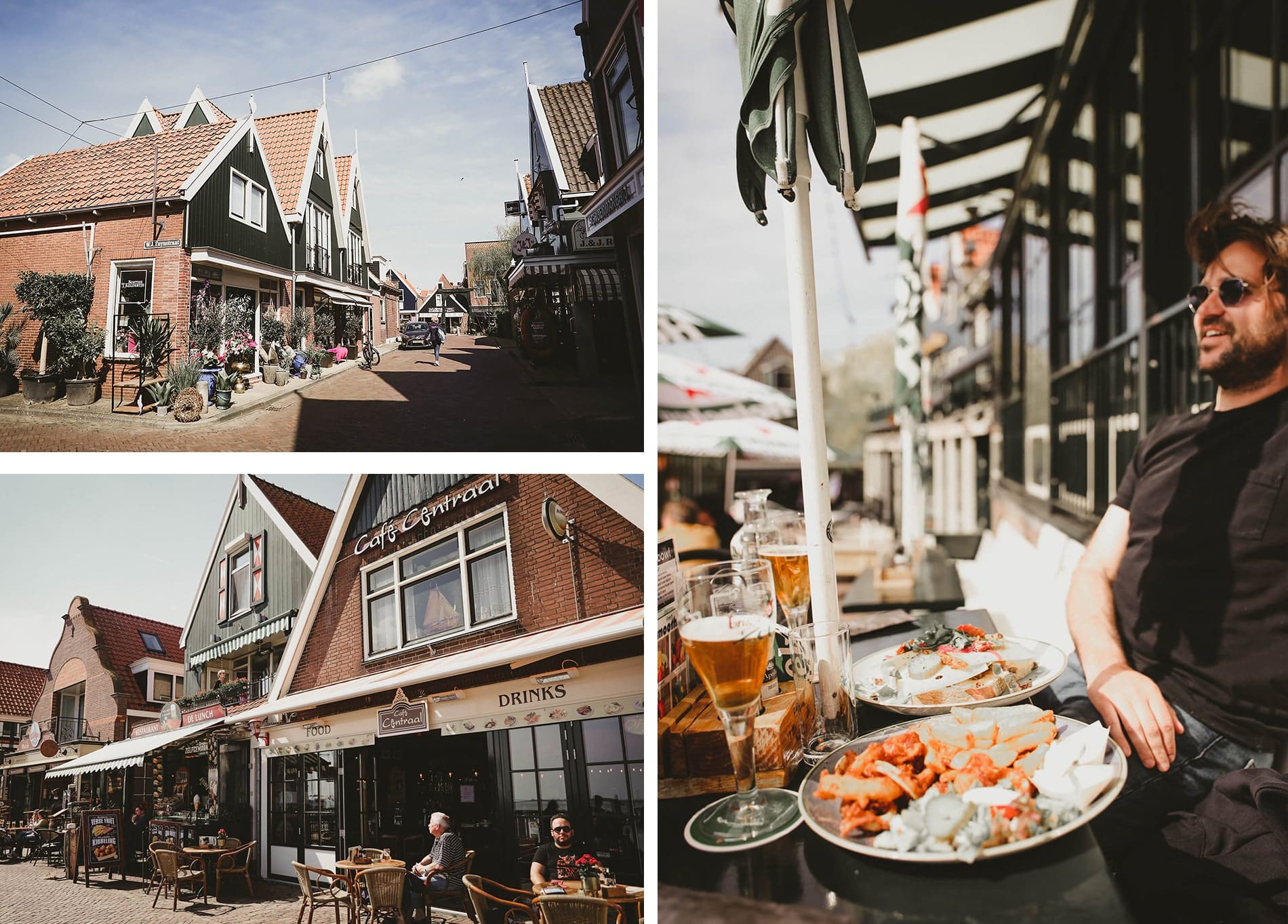 Nous avons repris la route en direction de Volendam, un charmant village portuaire sur les rives de l’IJsselmeer. Il faut arriver assez tôt pour éviter la horde de touristes. Ce village n’est pas un coup de cœur car il est très touristique, mais nous avons tout de même aimé les maisons traditionnelles en bois, les chalutiers et les bateaux de pêche en activité ainsi que le quai principal de ce petit port de pêche, transformé depuis en une rue commerçante et résidentielle plutôt animée. On s’est d’ailleurs posé au soleil sur la terrasse du T’Havengat pour le déjeuner et déguster leurs spécialités locales. L’odeur des fruits de mer et des calamars frits nous a réveillé les papilles. Volendam reste une étape intéressante mais ne vous y attardez pas trop car Marken a beaucoup plus de charme !