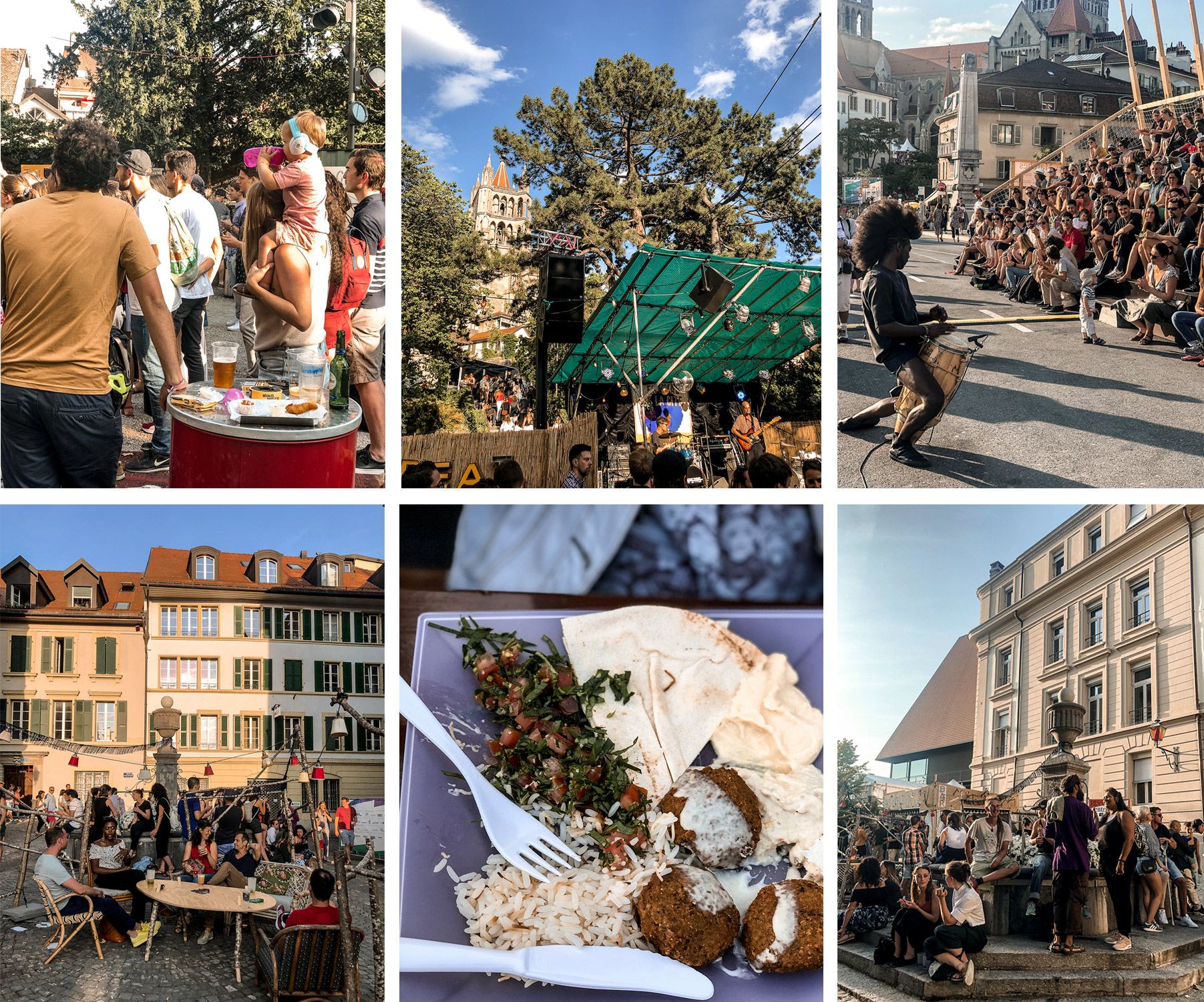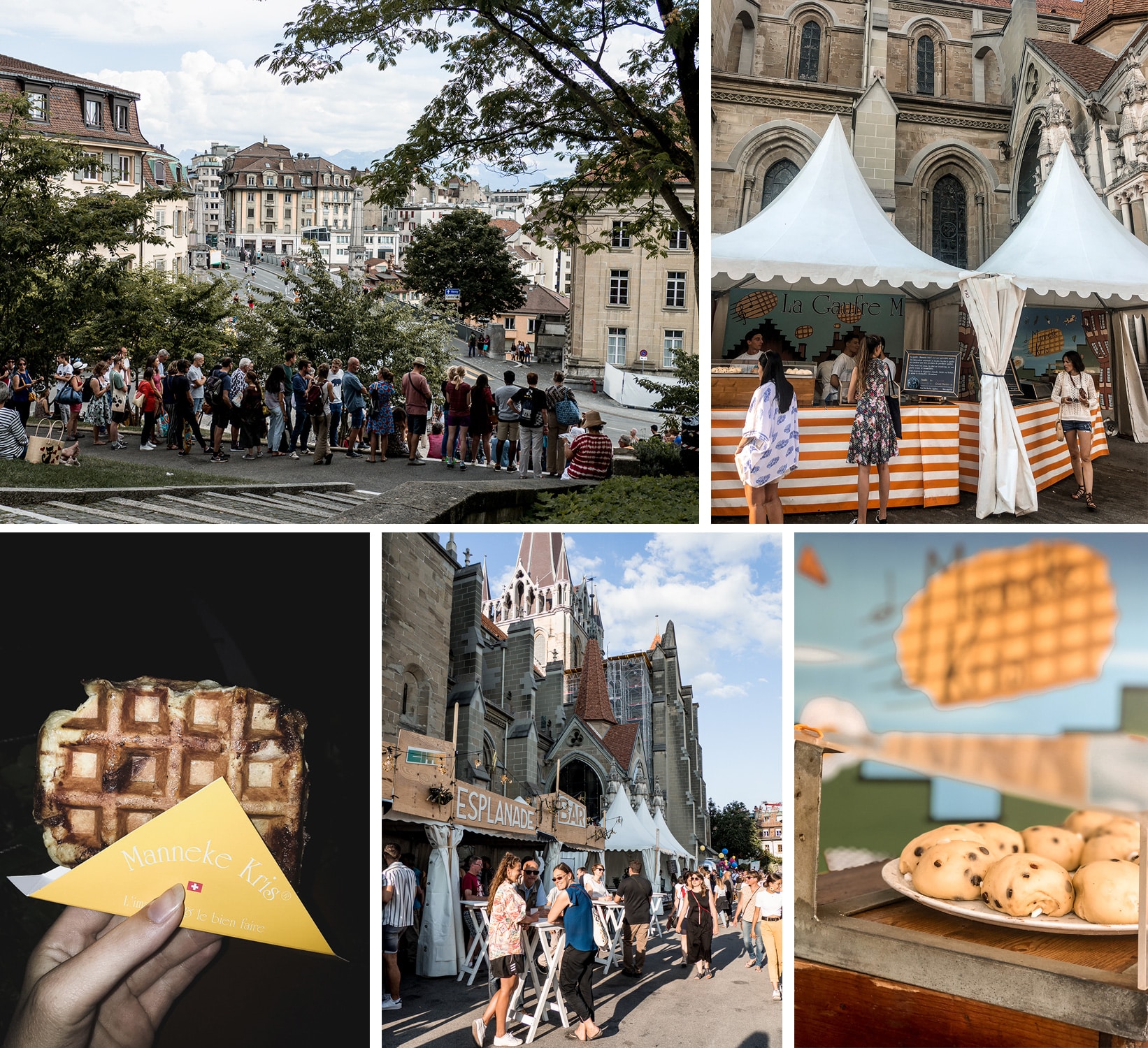 En plus d’être fort sympathique, ce festival qui se vit entre amis et en famille propose une multitude de petits coins fabriqués en bar palette et installées aux coins de la ville mais aussi des food trucks vendant de nombreuses spécialités culinaires. La zone principale de restauration se situe sur l’Esplanade de la Cathédrale, à l’entrée sud du Festival. On y trouve des burgers, des pizzas, des spécialités iraniennes, vietnamiennes, brésiliennes, libanaises etc mais aussi des glaces et les meilleures gaufres du pays! Comptez CHF 15/p pour un plat. En effet la gaufre « Manneke Kris » est une spécialité maison, de fabrication artisanale. La pâte ne contient que des produits de premium qualité. Sur ce festival, elle est cuite sous vos yeux et cette pâte se transforme en une gaufre ronde et caramélisée avec plusieurs parfums possibles comme la vanille, le chocolat, la cannelle… comptez CHF 6/p.