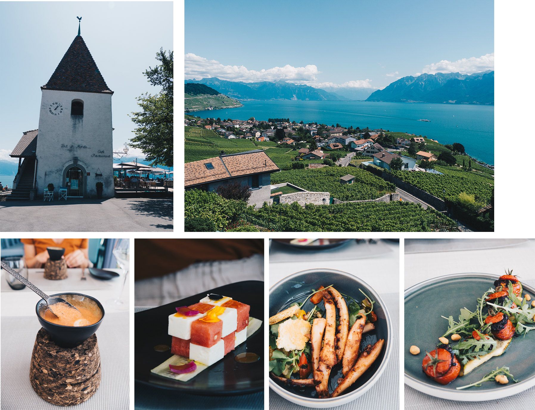Une fois la dégustation faite, il vous faudra prendre le petit chemin assez pentu, qui traverse les vignes et vous diriger vers ce vieux clocher réhabilité de Bourg en Lavaux pour déjeuner dans un restaurant surplombant les vignes et le Lac. Bienvenue au restaurant Tout un Monde. Cette adresse est bien connue des locaux et de ceux qui apprécient les plats raffinés. Vous pouvez soit choisir une table à l’intérieur pour observer le chef et son équipe à l’œuvre en cuisine ou vous vous installez dehors sur la terrasse pour admirer le bassin Lémanique. Le Tout un Monde mise sur des valeurs sures, le local aussi bien au niveau des produits que des boissons.