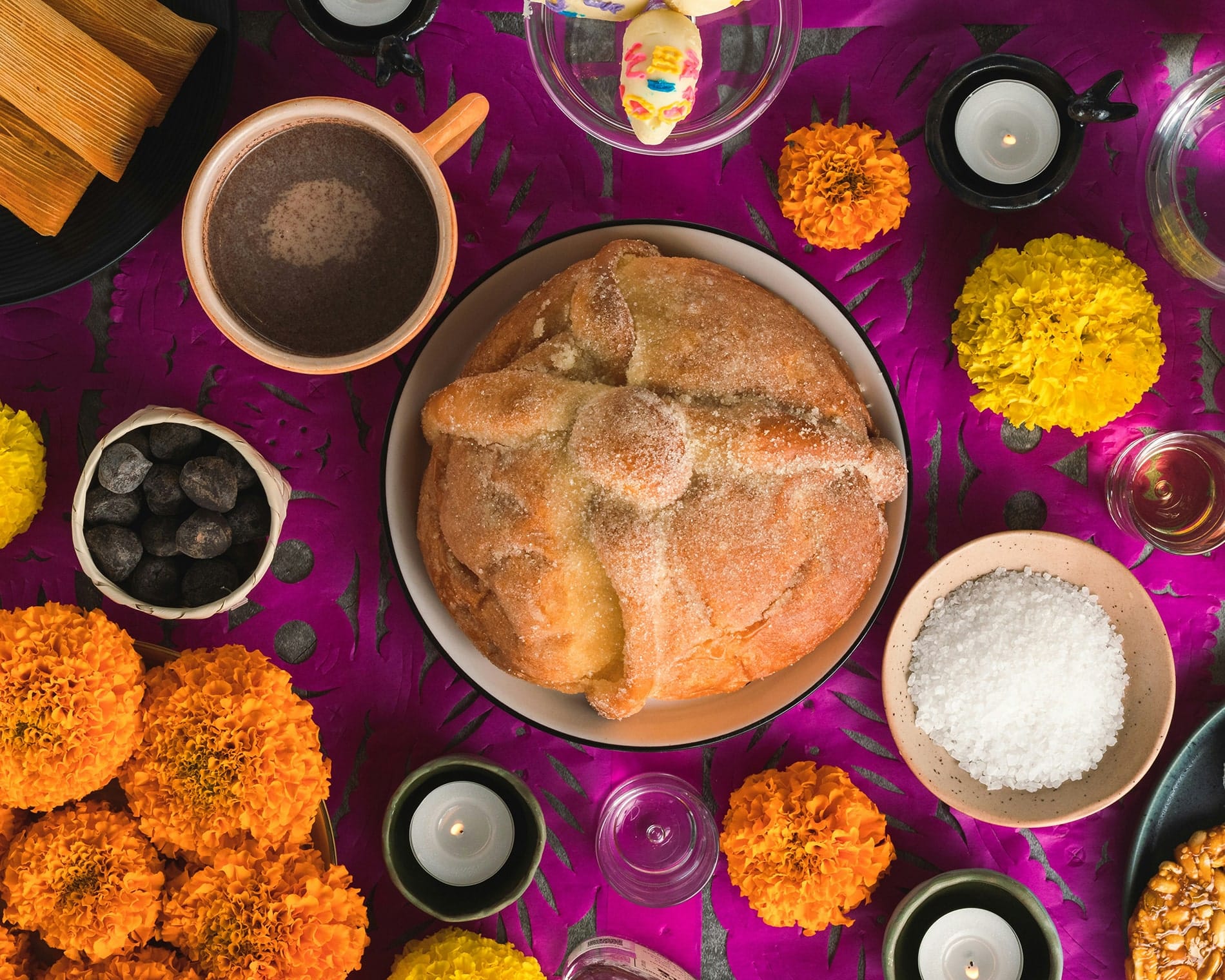 Au Día de los Muertos, on célèbre aussi les plaisirs simples de la vie : manger, partager, rire ensemble. Sur les autels, on dépose souvent le fameux Pan de Muerto, un pain sucré décoré d’os stylisés, symbole du cercle de la vie et de la mort. Il est souvent accompagné d’atole, une boisson chaude à base de maïs, et d’autres plats que les défunts appréciaient.