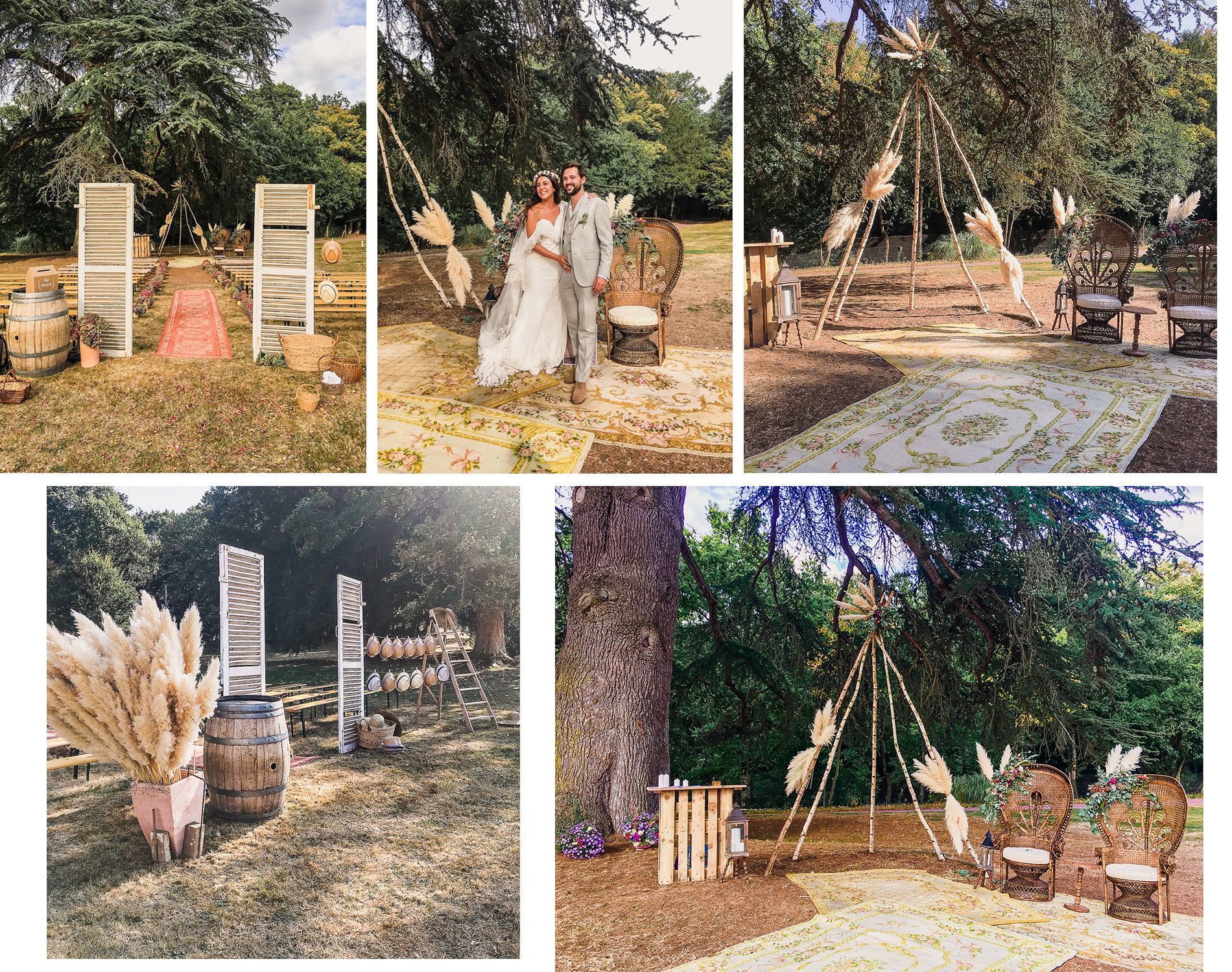 Pour la cérémonie laïque dans les jardins du domaine, je lui ai loué 3 grands tapis ainsi que le long tapis central, 2 fauteuils Emmanuel avec leur table et les 2 portes persiennes blanches. Le samedi matin, quelques heures avant le jour J, Gwendal s’était occupé de la mise en place et nous avait également installé des portes chapeaux suspendus par une corde pour se protéger du soleil car il allait faire chaud! Pour la décoration florale, retrouvez tous nos conseils dans notre article.