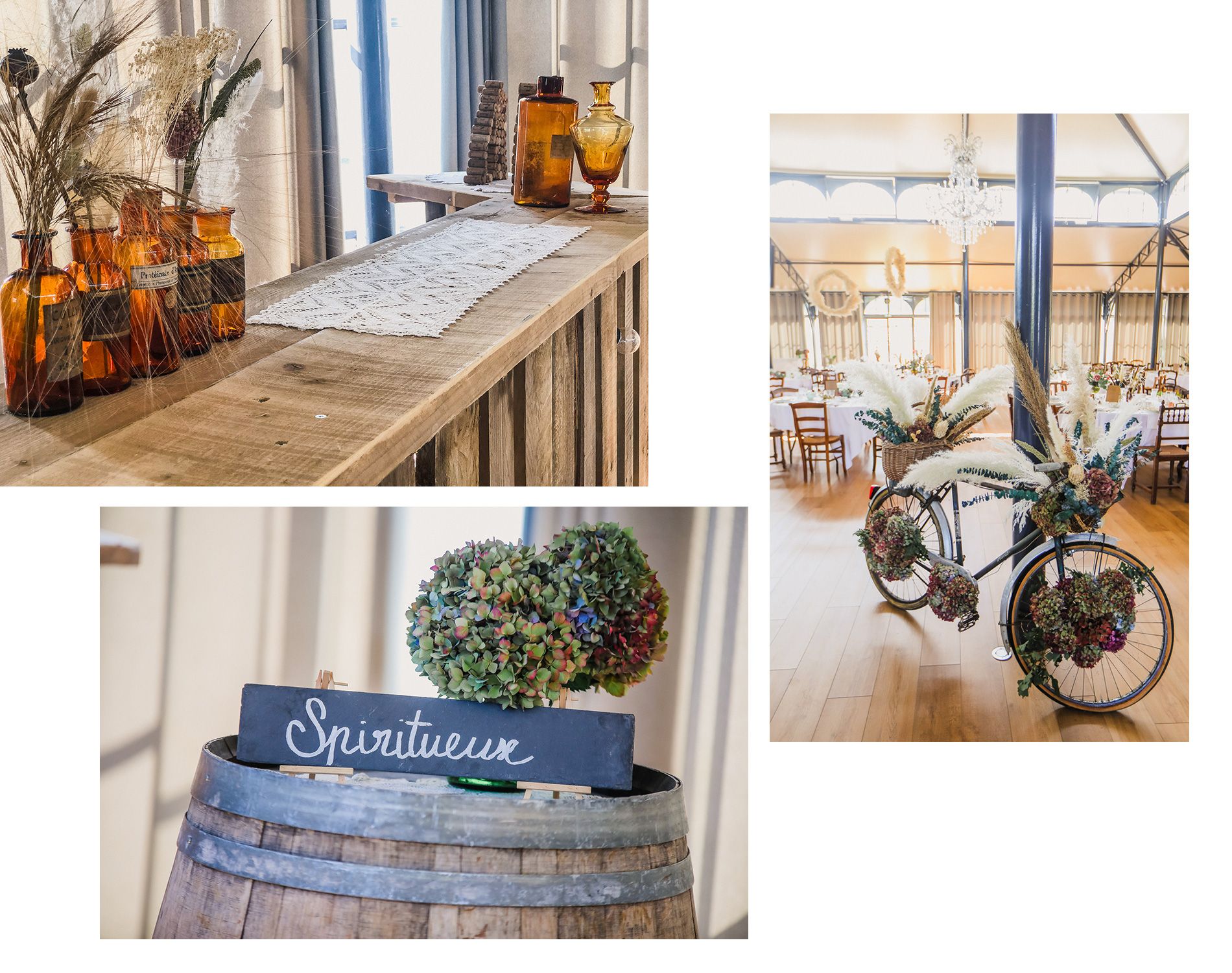 Pour la décoration de la salle du dîner, la verrière suffit à elle-même pour rendre le lieu magique! Les lieux trop grands sont souvent difficiles à habiller si l’on n’ pas le budget déco et fleurs qui suivent derrière. On a simplement créer plusieurs univers à savoir celui du photobooth dans le coin. On a également crée un grand coin bar en palette crée pour l’occasion par Antoine et ses témoins. On a rajouté quelques tonneaux de vins pour superposer des bouteilles de digestifs et créer un espace mange debout.