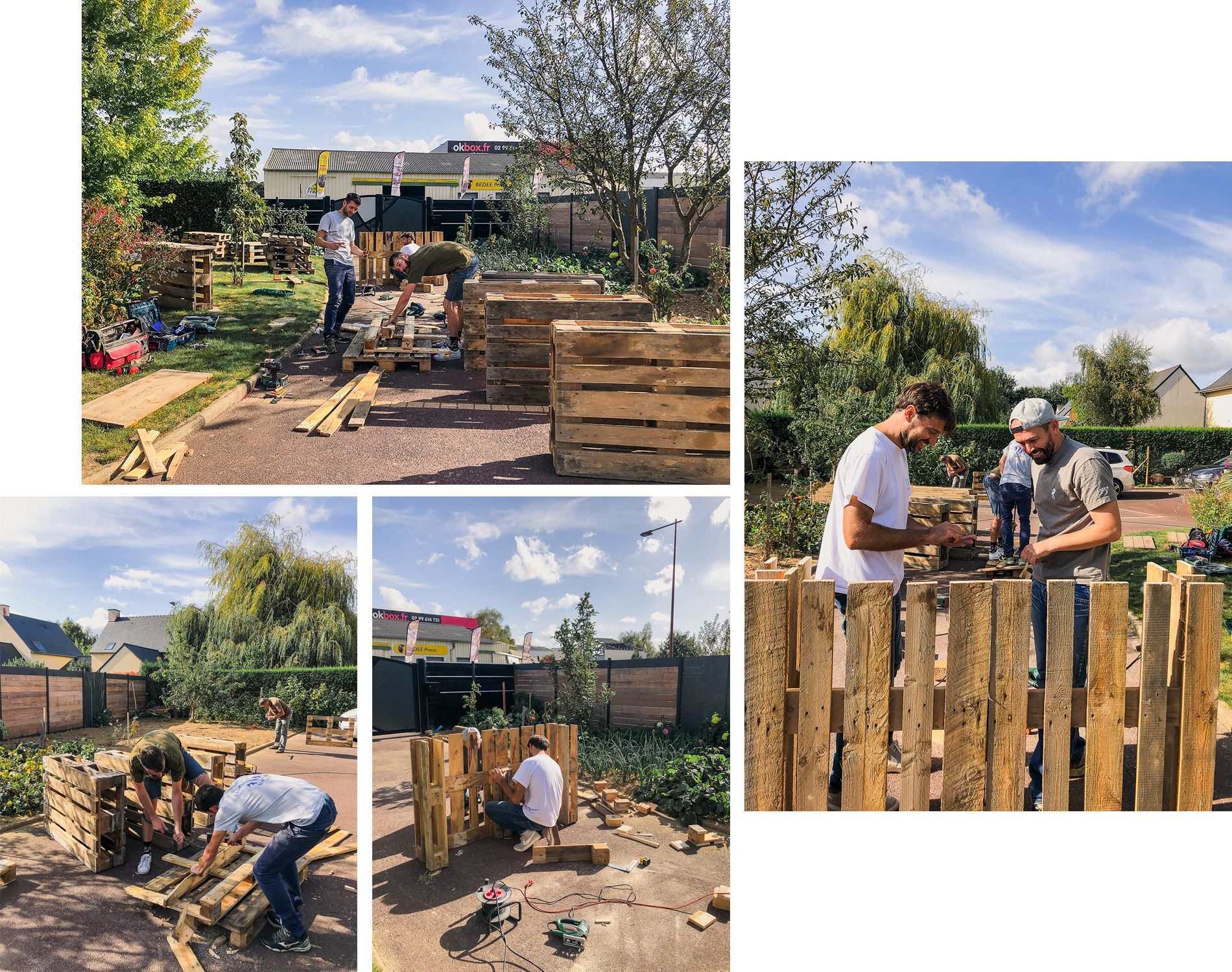 Sur un weekend, Antoine et ses témoins ont fabriqué un grand bar en bois et 10 mange-debout en palette que nous avons disperser dans le jardin pendant le cocktail. C’est toujours plus simple et pratique pour poser son verre, son assiette ou sa pochette pour nous mesdames. Nous avions également prévu des salons en palette et quelques chaises pour pouvoir s’asseoir car les pieds chauffent depuis 13h!