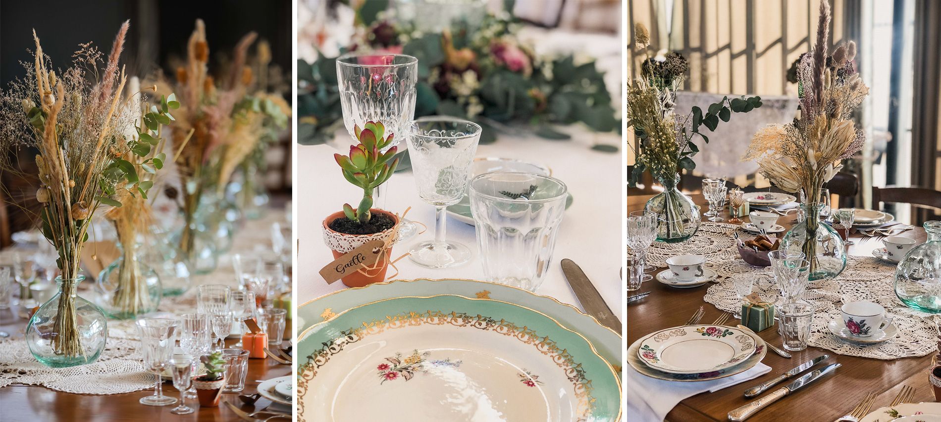 Après mure réflexion, nous avions décidé finalement de diminuer voire d’annuler certaines idées que nous avions eu, d’augmenter notre budget décoration, et de passer par lui pour louer notre vaisselle vintage dépareillée. On s’est vite rendu compte que seuls, nous ne pourrions pas réunir autant de choses et que Gwendal pouvait nous apporter le petit plus de notre mariage. Il a été à l’écoute de nos envies sans rien nous imposer et il a sur nous faire des propositions de table et de déco car il a l’habitude de mettre en scène des évènements. Je savais que j’avais trouvé le bon binôme pour ce mariage et c’était un véritable soulagement. En réunissant nos trouvailles avec celles de Gwendal, nous avons pu créer une ambiance parfaitement dans le thème. Pour le code couleur de la décoration, nous avons suivi ses conseils et sommes partis sur deux teintes chaudes, du vert et du ambré. On a également décidé de jouer sur les contrastes et les hauteurs pour donner de la profondeur et attirer le regard.