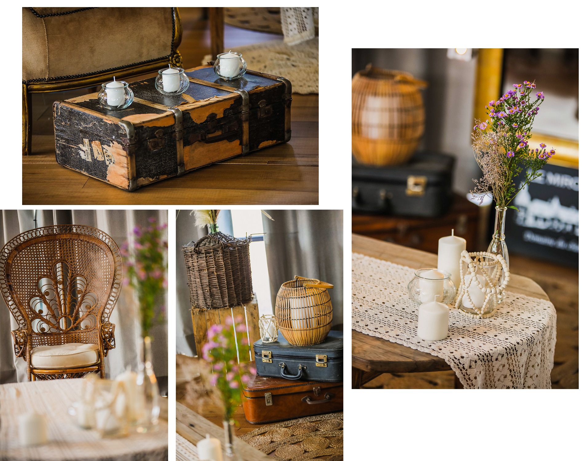 Toute la décoration du plan de table m’appartenait et avait été soit chinée dans des brocantes, soit sur Etsy, soit c’était la décoration de chez moi à savoir: les caisses en bois, l’escabeau, les bougeoirs, les paniers, les lampes à huile, les cadres, les dessous en dentelle, les malles de voyage… Le seul inconvénient a été de les transporter sur plusieurs trajets Paris → Rennes.