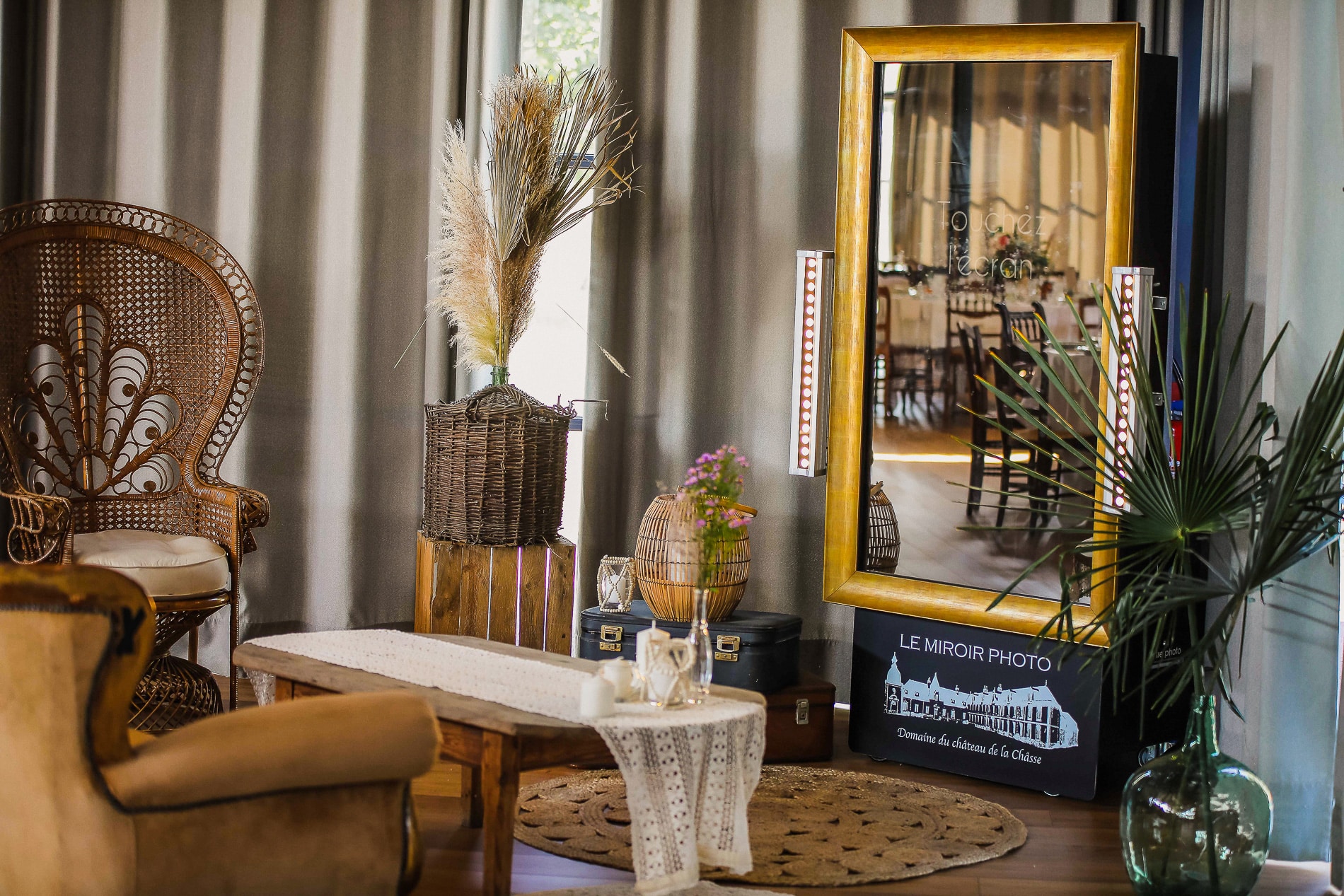 Rencontré lui aussi sur le salon, son stand tape à l’œil avec son photobooth végétalisé puisqu’il est le créateur de Robot photo. Imaginez à votre mariage, une borne photos de taille humaine, ludique et en forme de miroir ancien. On est totalement dans le thème non ? Cet immense miroir est hyper facile d’utilisation. Une fois posé et branché, il suffit de se positionner devant, de sélectionner le type de photos (portrait ou paysage, couleur ou noir et blanc) et de toucher l’écran! Côté décoration, je voulais une ambiance « comme à la maison » et un esprit voyage bohème avec des malles, une petite table basse en bois, un tapis, des dame jeanne et des fleurs séchées. L’effet était juste Waouh et je pense avoir impressionnée tous mes invités.