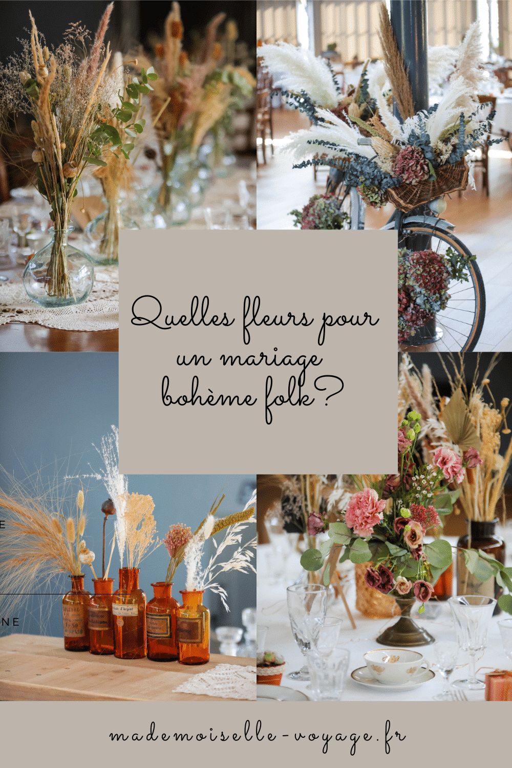Après nos articles sur la décoration du mariage bohème, comment trouver sa robe de mariée, nos conseils sur les prestataires beauté, et les autres prestataires indispensables à ne pas négliger, on s’attaque au choix des fleurs! Et quand on souhaite un décoration bohème folk, on mise sur les fleurs sauvages, les fleurs séchées et les graminées! Oui d’accord mais par quoi on commence ? Comme pour la décoration, je vous invite à cliquer sur mon pinterest pour vous inspirer et sélectionner les fleurs qui vous plaisent.