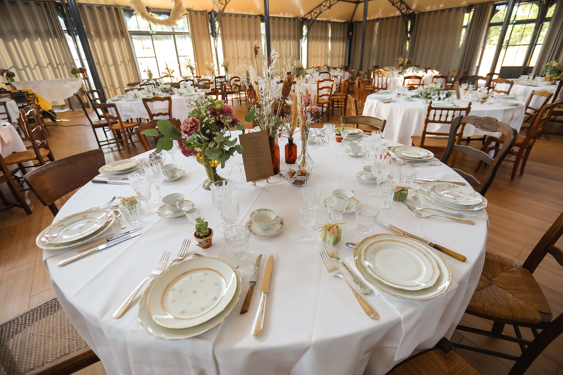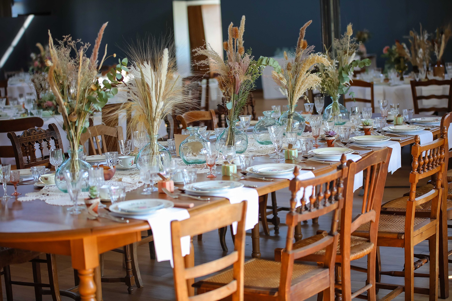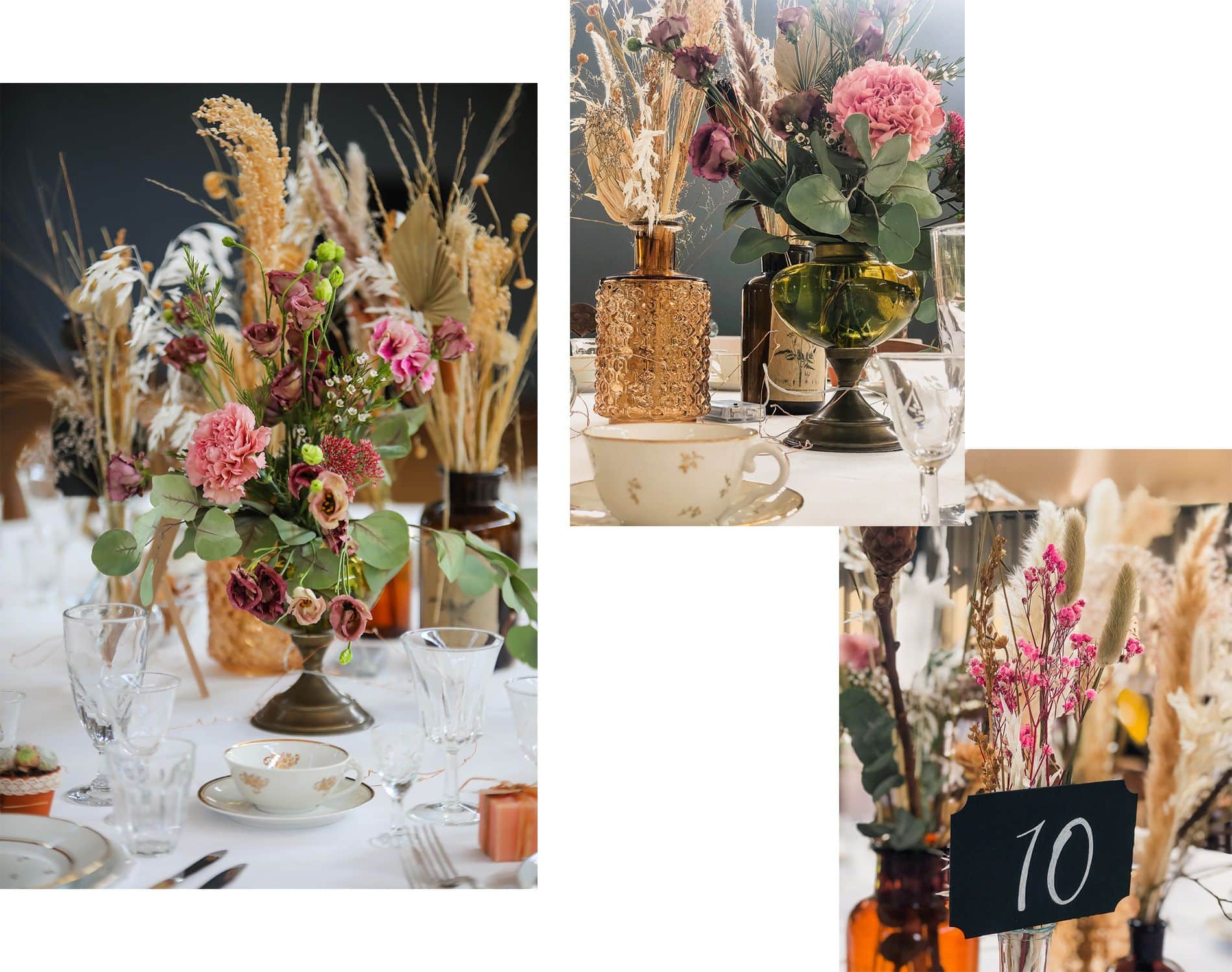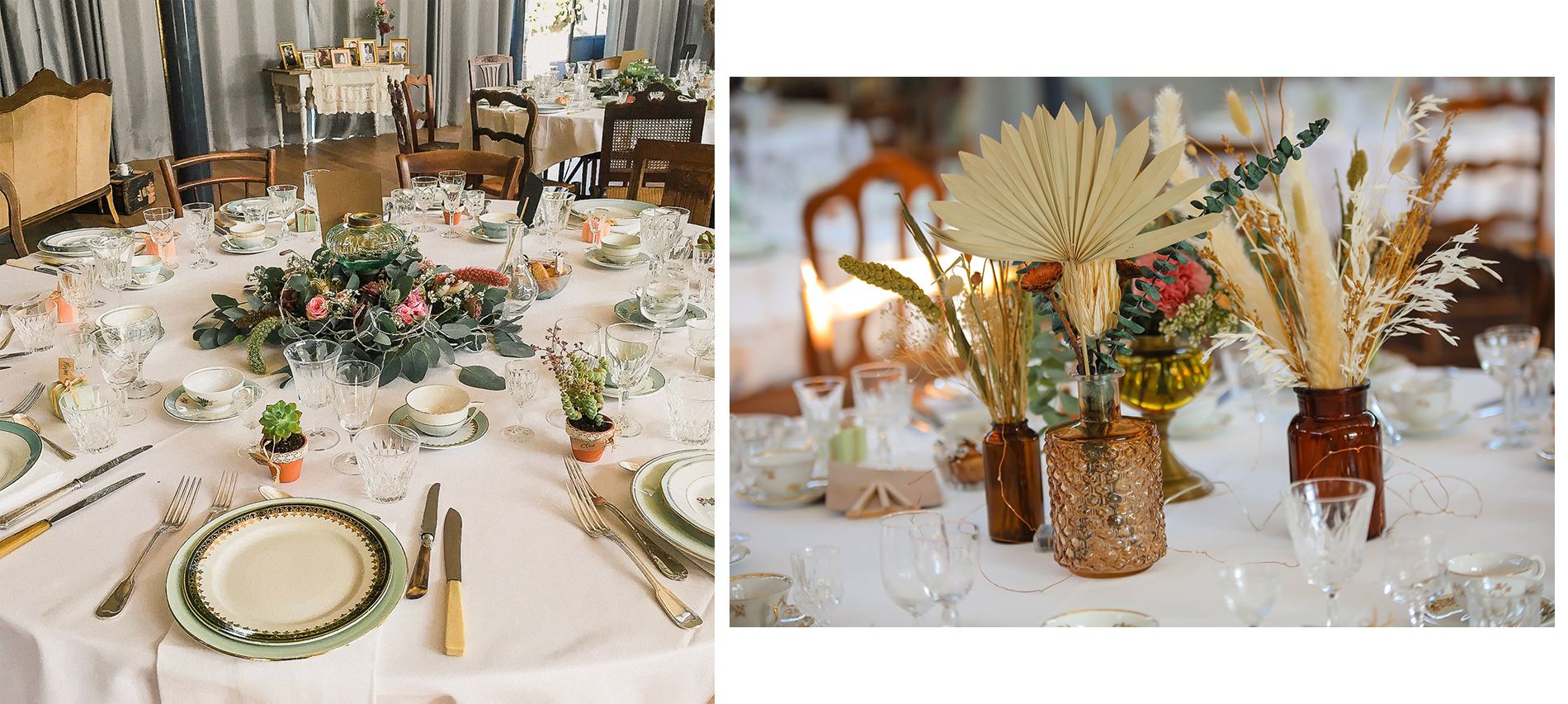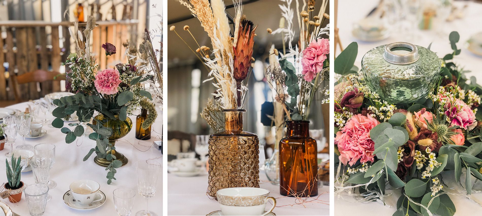 Elle a été de très bons conseils car nous avons décidé ensemble de finalement créer des couronnes de tables plates composées de fleurs fraîches et fleurs séchées sur la moitié des tables et des bouquets de fleurs dans des pots d’apothicaires et des vieux vases vintage pour créer de la hauteur. L’idée était parfaite et totalement adaptée à l’endroit.