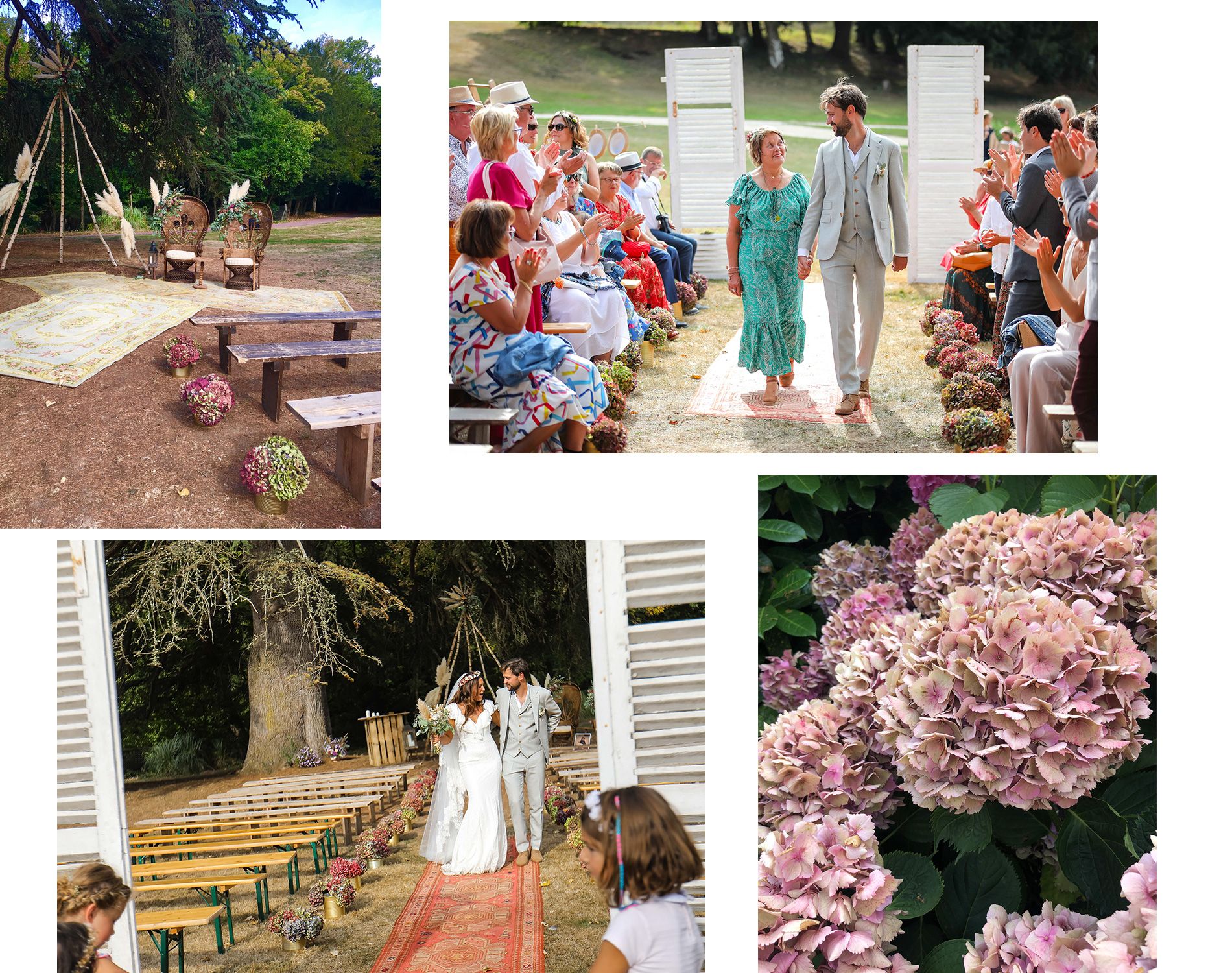 En effet, je voulais beaucoup d’hortensias pour fleurir l’allée de ma cérémonie laïque mais une fois de plus, la tige d’hortensia coûte très chère (minimum 7€ ma tige!)! Il existe une multitude de couleurs mais je voulais des tons poudrés, bordeaux, nuancés et ce ne sont pas les plus évidents à trouver. Par chance, l’Ille et Vilaine est également une région d’hortensias donc autant vous dire que j’ai demandé à tout le monde de m’en garder un peu par ci par la. Résultat, des centaines d’hortensias m’attendaient sagement dans le garage quelques jours avant le mariage. Une voisine de ma belle mère avait sans vous mentir, au moins 200 hortensias sur plusieurs pieds, dans la couleur que je voulais. Un bonheur inimaginable quand j’ai tout coupé au sécateur! Mais la aussi, pensez au stockage des fleurs! Le garage et le jardin de mes beaux parents étaient devenus un immense chantier, une serre géante avec des vases partout, que j’ai bien évidemment adoré bichonner! Rendez-vous sur l’article décoration du mariage pour plus de détails sur les décorations Do It Yourself.