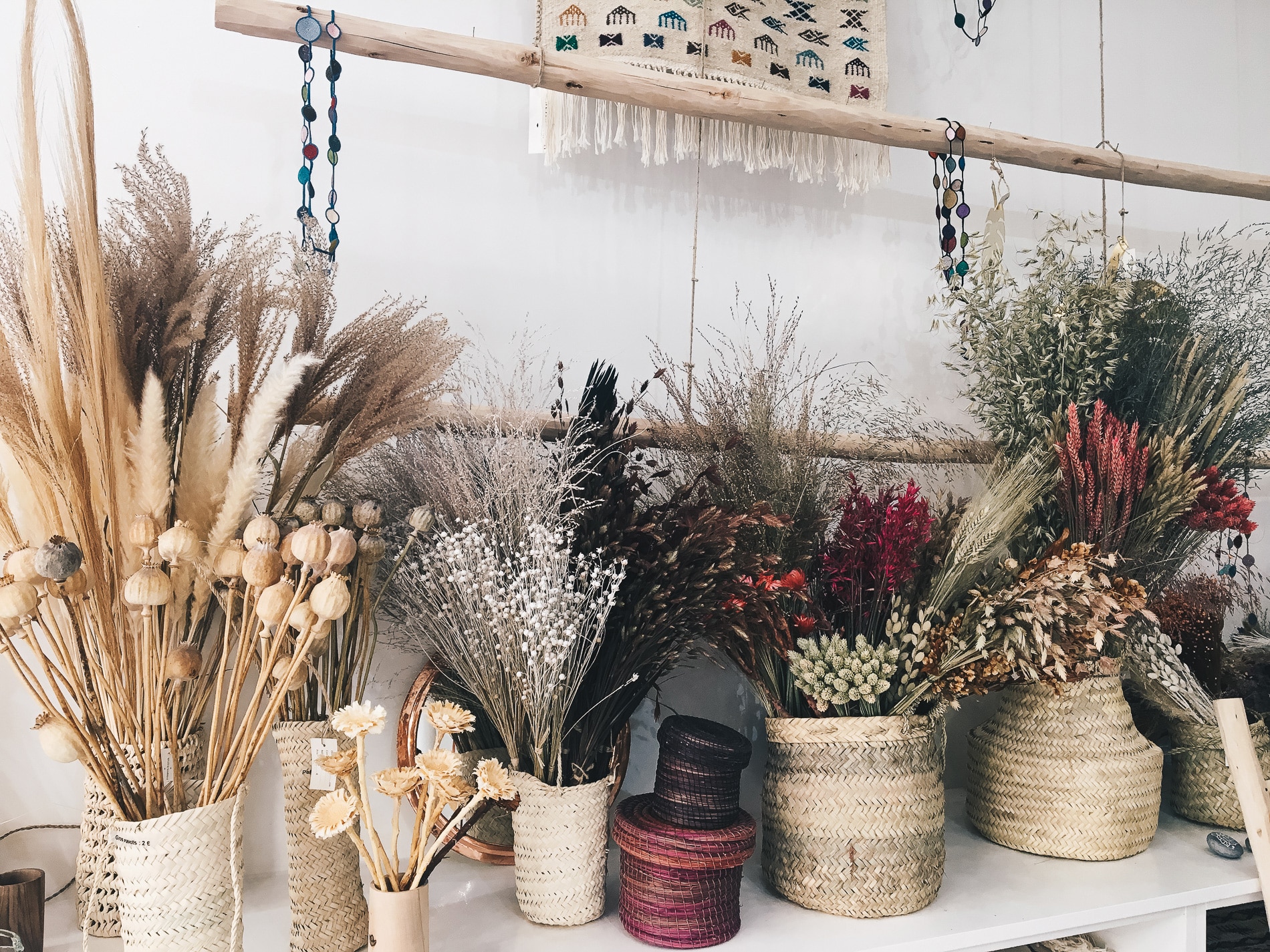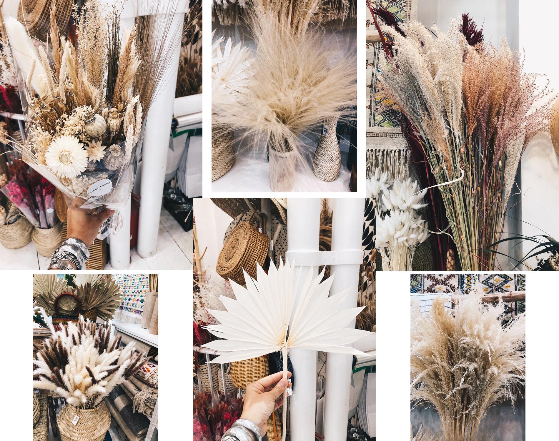 Je ne voyais pas mon mariage bohème folk sans des fleurs séchées et des graminées! C’est tellement moi et tellement mon thème. Je ne souhaitais pas de bouquets plus traditionnels alors je me suis creusée la tête. C’est en me baladant par hasard dans le quartier du 10ème arrondissement de Paris, que je suis tombée sur Pompon Bazar, au 15 rue du Château d’eau. Corinne Marchetti, la propriétaire d’origine méditerranéenne est une grande voyageuse mais sur tout une passionnée de déco avec un goût indéniable pour les belles choses. Elle a sélectionné dans sa belle boutique, de très belles pièces venus des 4 coins du monde: des tapis colorés tissés à la main dans des matières naturelles et confortables, en passant par des objets de décoration en osier mais aussi des bouquets de fleurs séchées. En passant la porte, on a l’impression d’être dans une maison de vacances avec toutes ces couleurs subtiles, douces et chaudes et qui s’adaptent à chaque saison.