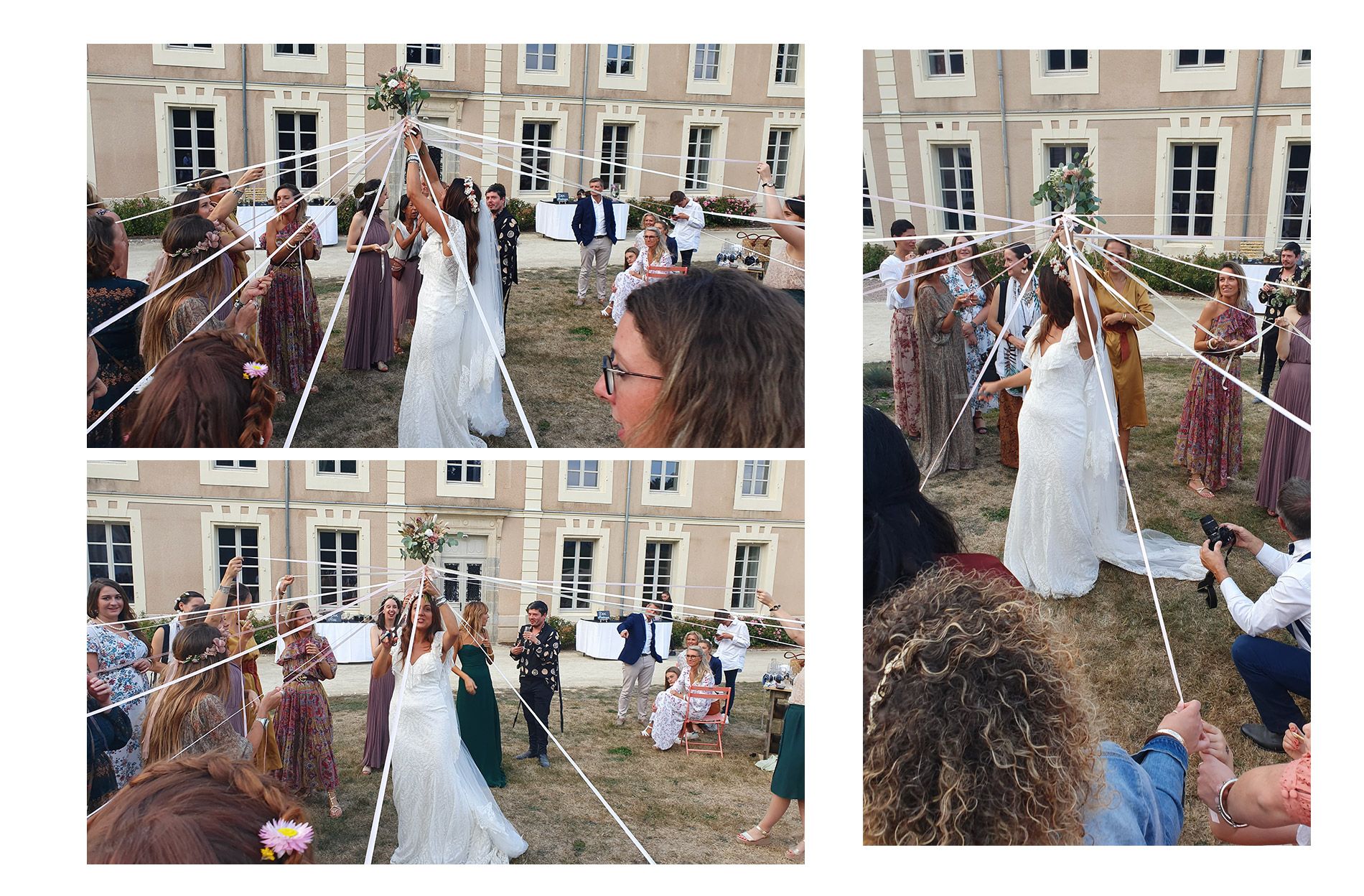 Pour le jeu du bouquet de la mariée, je ne voulais pas faire un simple lancé du bouquet. J’avais vu le jeu des rubans et je trouvais cela plus participatif. Comment ça marche ? La mariée brandit un bouquet assez haut et les participantes tournent en musique, dans le sens contraire de l’enroulement des rubans afin de les dérouler. Il est également possible de le faire dans l’autre sens à savoir, que chacune des filles tient un ruban par la main et enroule le bouquet de la mariée avec le ruban. A l’aide d’un ciseau, la mariée coupe les rubans un à un, en prenant bien soir de ne pas regarder à qui appartiennent les rubans. (pensez à lever la tête vers le haut en coupant). C’est ludique, original et différent. Votre fleuriste peut vous préparer un deuxième petit bouquet pour ce jeu.