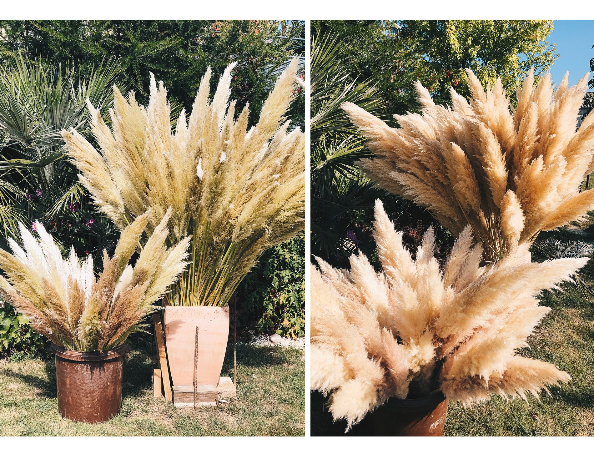 En septembre, j’ai donc avec l’aide de mon beau père, coupé des centaines de pampas, environ 500, pour un effet Waouh! Et plus, il y en a, plus ça en jette! Il m’en fallait partout: pour mon arche, l’entrée de la cérémonie laïque, sous la verrière, au dessus de ma table d’honneur, dans le bouquet, sur le vélo… j’étais vraiment devenue accro! Mais couper 500 pampas, ça demande des bottes, plusieurs sécateurs de différentes tailles, des gants, une remorque, une motivation extrême et de l’huile de coude car lorsqu’ils sont très feuillus, il peut y en avoir une centaine à couper par pied. Les feuilles des tiges ressemblent vous coupent la peau et les courbatures se font ressentir. Il vous faut aussi une remorque pour transporter ces longues tiges qui pèsent toutes ensemble et un coin pour les stocker. J’ai choisi 4 gros sceaux et une jarre pour entreposer la marchandise dans le jardin de mes beaux-parents.