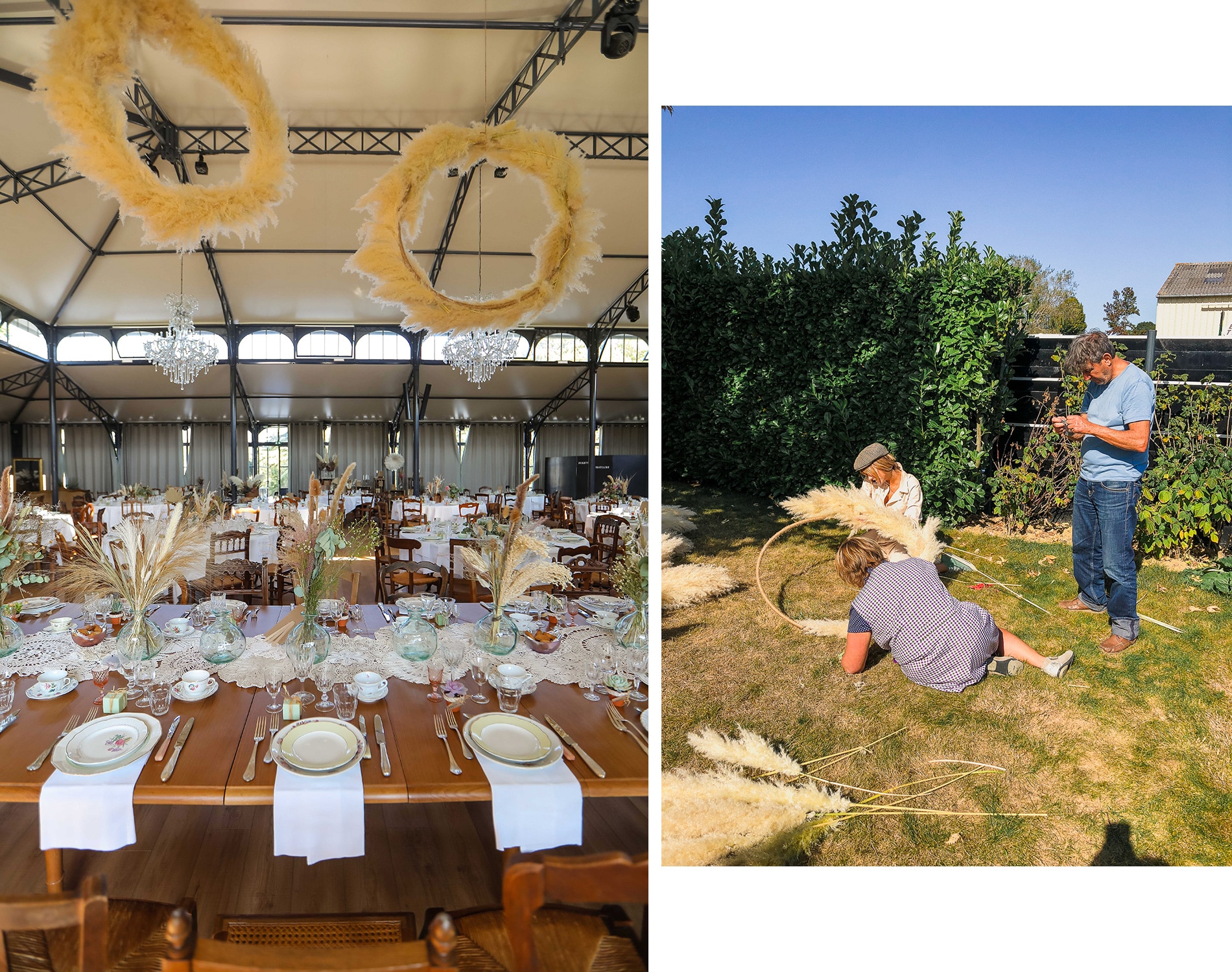 Ma sœur, ma belle-mère et mon papa m’ont également aidée dans la confection de mes magnifiques cerceaux suspendus. Très simple à réaliser, il faut tout de même quelques soirées et heures de travail pour ficeler avec de la corde les 2 cerceaux d’un mètre de diamètre, puis agripper 1 à 1 chaque pampa tout autour.