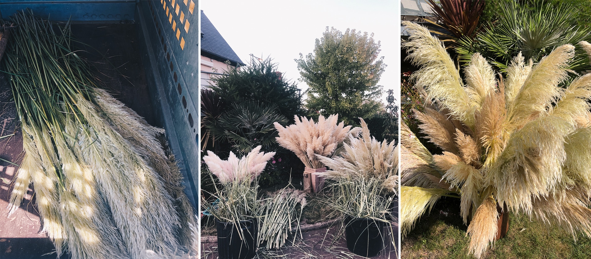 Voila pourquoi elles coutent si chères: les pampas se font plus rares, sont difficiles à récolter et ne poussent pas partout. Mais comme j’ai beaucoup de chance, on en trouve beaucoup en Ille et vilaine et dans le Morbihan. Le souci, c’est qu’il faut connaître les coins pour les couper. Souvent plantées chez des particuliers, il faut pousser la porte et demander l’autorisation. Ayant un beau père adjoint au maire, très investi dans sa commune, cela m’a été beaucoup plus facile pour en trouver puisqu’il a fait appel à tous ses contacts pour m’aider sur ce coup la. Un an avant, je suis également partie sillonner toutes les routes de campagne (enfin presque) du département à la recherche de pampas! Si, si je ne vous mens pas!