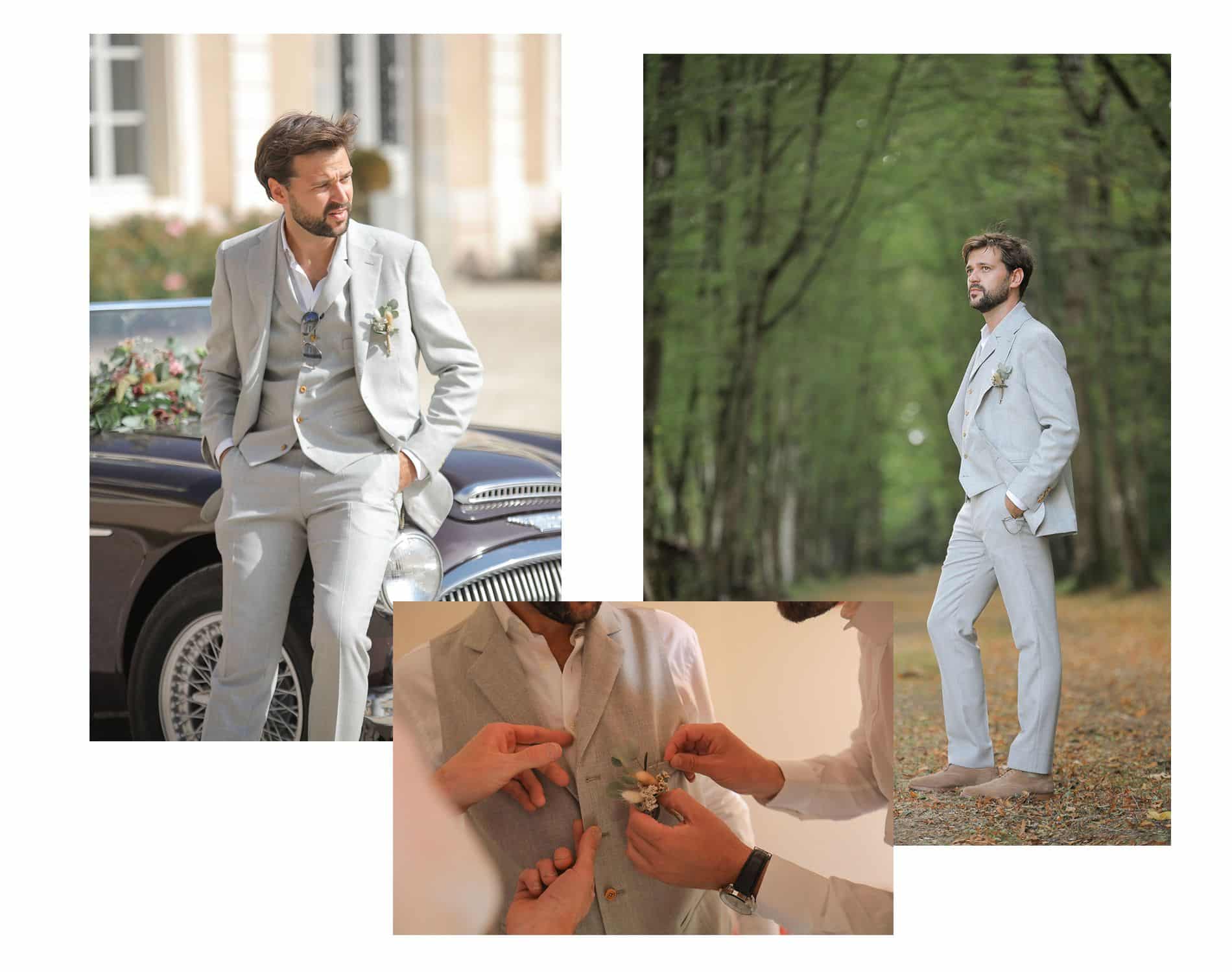 Pour mon mariage, j’ai choisi le modèle Sisley à 130€ pour sa taille + les couleurs du modèle Abbey avec ses petits boutons de roses anglaises, ses eucalyptus et hortensias stabilisés dans des tons pastel et nudes. J’ai également commandé la boutonnière assortie pour Antoine.