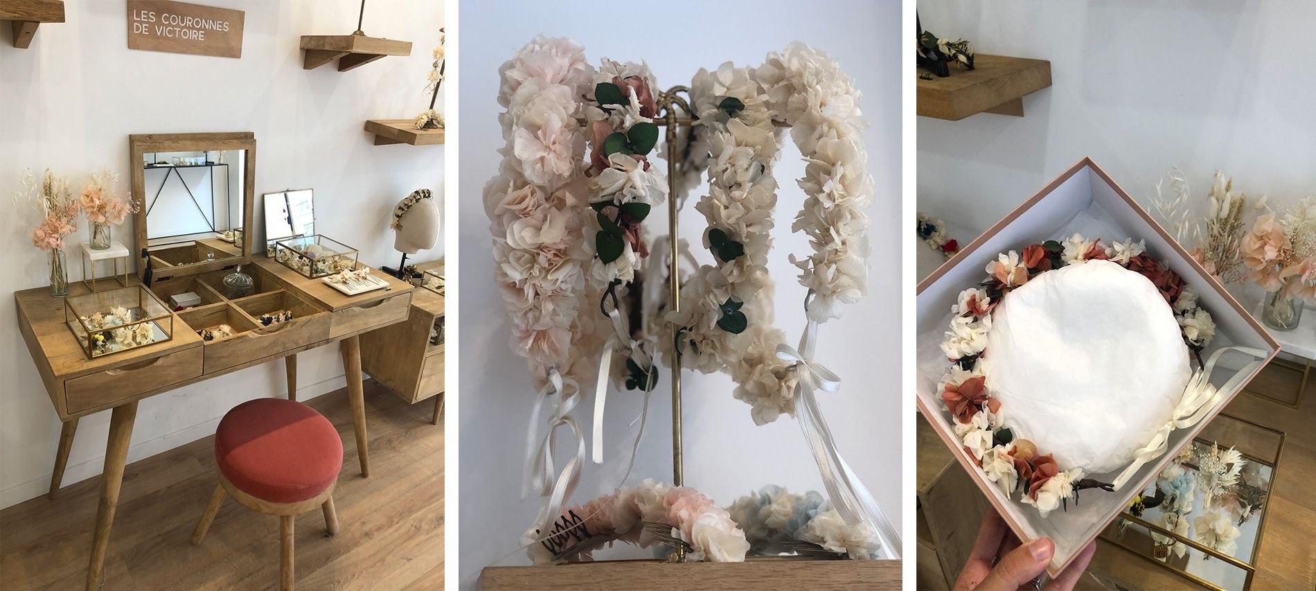 C’est ma témoin Jessica qui a trouvé ma couronne de fleurs et qui m’a emmenée découvrir l’univers des couronnes de victoire. Les accessoires de la marque sont fabriqués à partir de véritables fleurs naturelles qui ont été stabilisées à l’aide d’un procédé biologique entièrement naturel qui les fige tout en conservant leur souplesse. Chaque pièce est unique, de la conception à la réalisation, tous les accessoires sont fabriqués à la main dans leur atelier parisien. Les couronnes de victoire proposent des couronnes mais aussi des double peignes, des pics à chignon, des barrettes, des bracelets, des chapeaux, des coffrets, des serre-têtes, des ceintures… Je me suis rendue dans leur jolie boutique bohème au 230 rue Saint Martin, 75003 Paris, pour sélectionner mes couleurs, la taille de la couronne et le type de laçage. Vous avez déjà plusieurs modèles crées pour tester et vous inspirer.