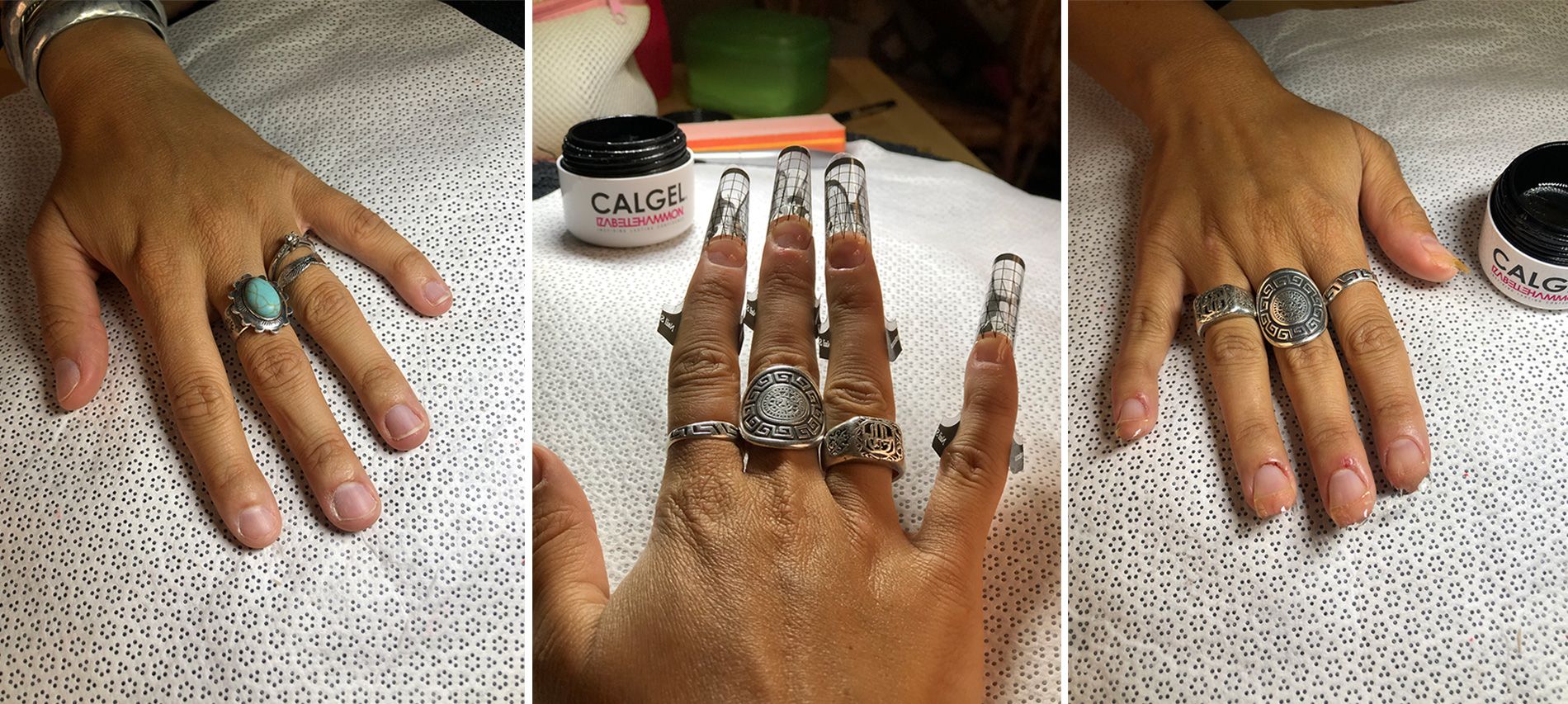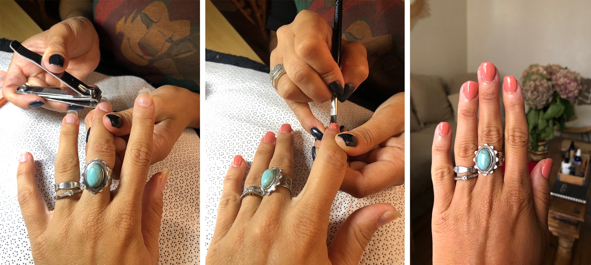 Concernant la manucure, je ne voulais pas de gels acryliques classiques car j’ai eu auparavant des mésaventures avec des ongles qui ont jauni. Je souhaitais tester depuis un moment les vernis calgel, des gels organiques microporeux qui n’altèrent pas le métabolisme naturel de l’ongle (en provoquant par exemple des mycoses) et qui le laissent donc respirer car l’air et l’humidité peuvent circuler.