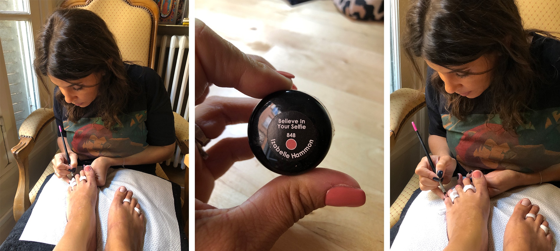 Elle se déplace avec tout son matériel et vous applique comme une manucure classique, le gel calgel. Il faut savoir que j’ai tendance à me ronger de temps en temps les ongles donc je n’aime pas trop mes mains. C’est pourquoi Stéphanie m’a dans un premier temps, reconstruit l’ongle de manière naturelle, pour un résultat très bluffant (comme vous pouvez le voir sur les photos) puis m’a appliquée le gel. J’ai choisi un vieux rose assorti aux teintes de mon bouquet. Ces capsules naturelles posées sont très souples à tel point que vous pouvez plier et retourner l’ongle dans tous les sens sans qu’il ne se casse. Le résultat est magnifique et a tenu quasiment 6 semaines avec bien entendu une repousse des ongles. En soi, le verni ne s’est pas du tout écaillé, la brillance était encore la tout comme la couleur. Pour retirer le vernis, rien de plus simple, il suffit juste de placer l’ongle dans une papillote d’aluminium imbibé d’un coton avec de l’acétone. Le gel s’enlèvera tout seul. Je dois vous avouer que j’étais impressionnée par cette manucure. Après les mains, elle s’est attaquée aux pieds dans la même couleur.