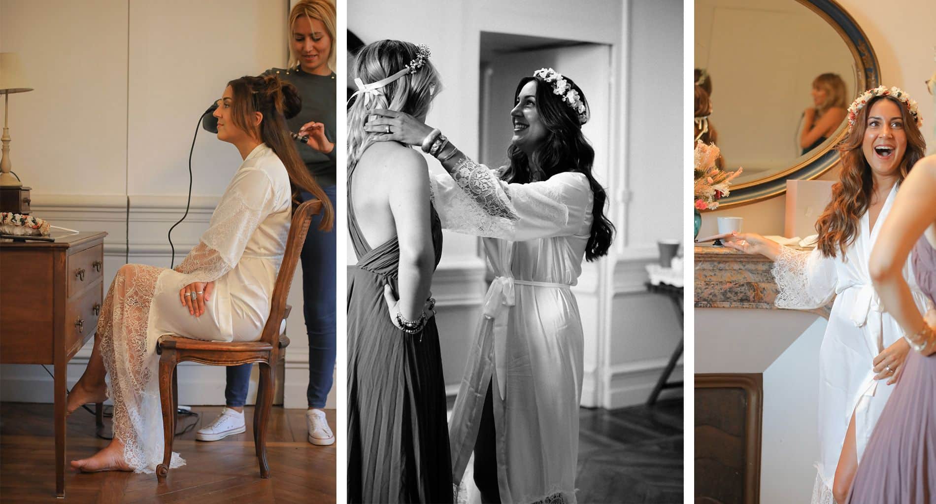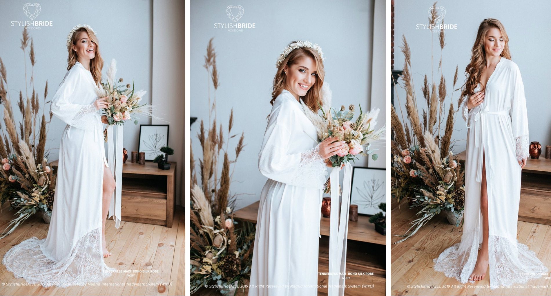 Il y a un accessoire que je souhaitais porter et qui je pense est indispensable le jour J: c’est la longue robe de chambre que vous allez mettre avant votre robe de mariée. On n’y pense pas tout le temps mais entre le moment où vous vous levez, douchez, maquillez, coiffez, attendez, prenez votre petit déjeuner… il s’en passe du temps et des heures avant que vous ne partiez pour la mairie. Vous allez aussi avoir des allées et venues de vos sœurs, amies, témoins, famille dans votre chambre nuptiale. Du coup, que souhaiteriez-vous porter pour les recevoir ?