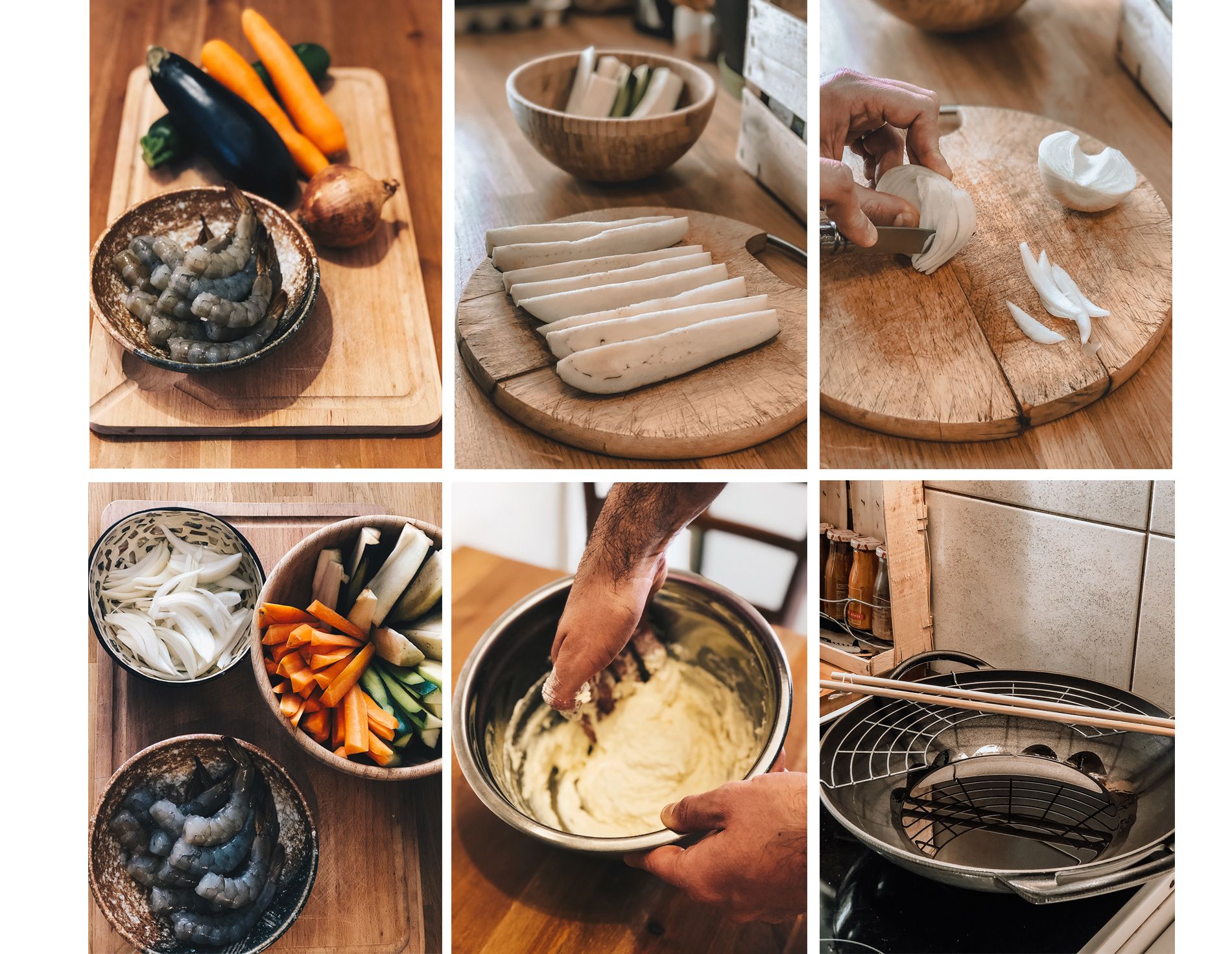 - Découpez vos légumes, en lamelles pas trop fines et en deux parties. Pour les oignons, faites des lamelles et pour la friture, vous les attraperez par plusieurs pour qu’ils collent bien.