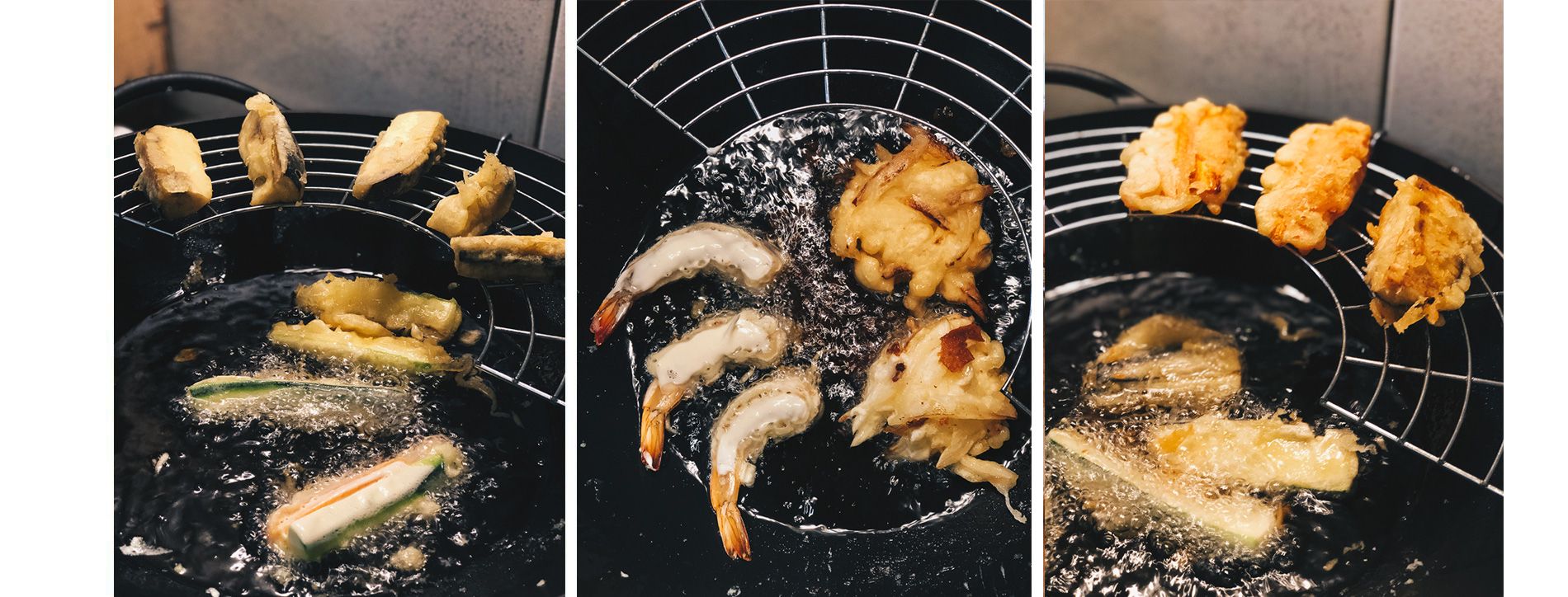 - Faites tremper vos légumes ou crevettes dans la pâte puis les insérer délicatement dans l’huile. Mettez les un à un pour éviter qu’ils ne se collent entre eux. Nous vous suggérons de commencer par la cuisson des légumes puis de terminer par les crevettes pour les garder bien chaudes au moment de la dégustation.