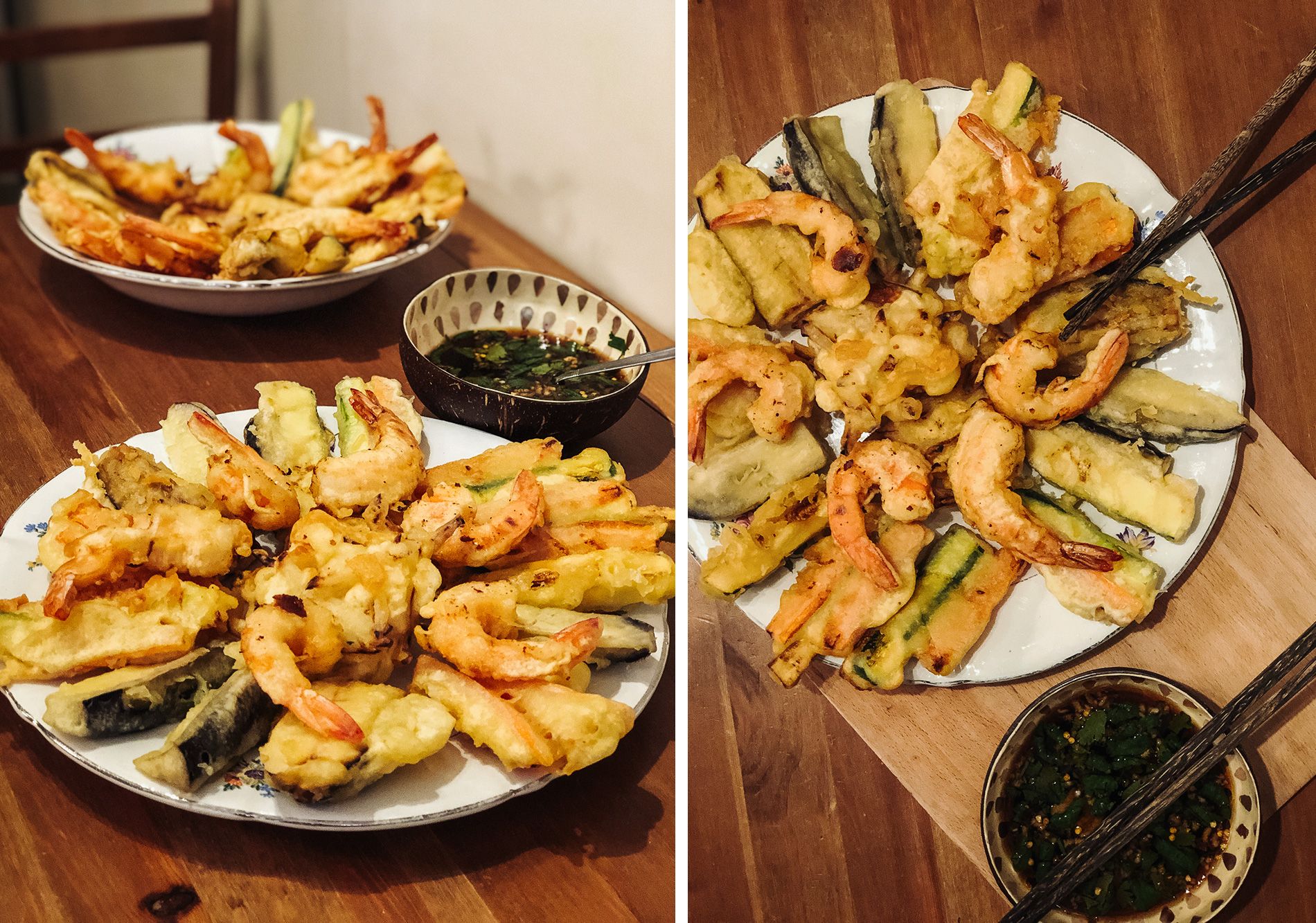 Hello tout le monde! Les tempuras sont des assortiments de beignets très populaires au Japon. On adore ça avec Antoine mais pour être honnête avec vous, on en mange rarement dans les restaurants car on les trouve souvent trop gras et la pâte trop épaisse donc moins facile à digérer. Pour la petit histoire, les tempuras ont été importés par les portugais au 16ème siècle. Ils ont été repris par les japonais qui les ont diversifié avec des légumes. Pour cette recette très conviviale et facile à faire, vous pouvez soit acheter la pâte toute faite en magasin asiatique soit la faire vous même si vous avez le temps et l’énergie.