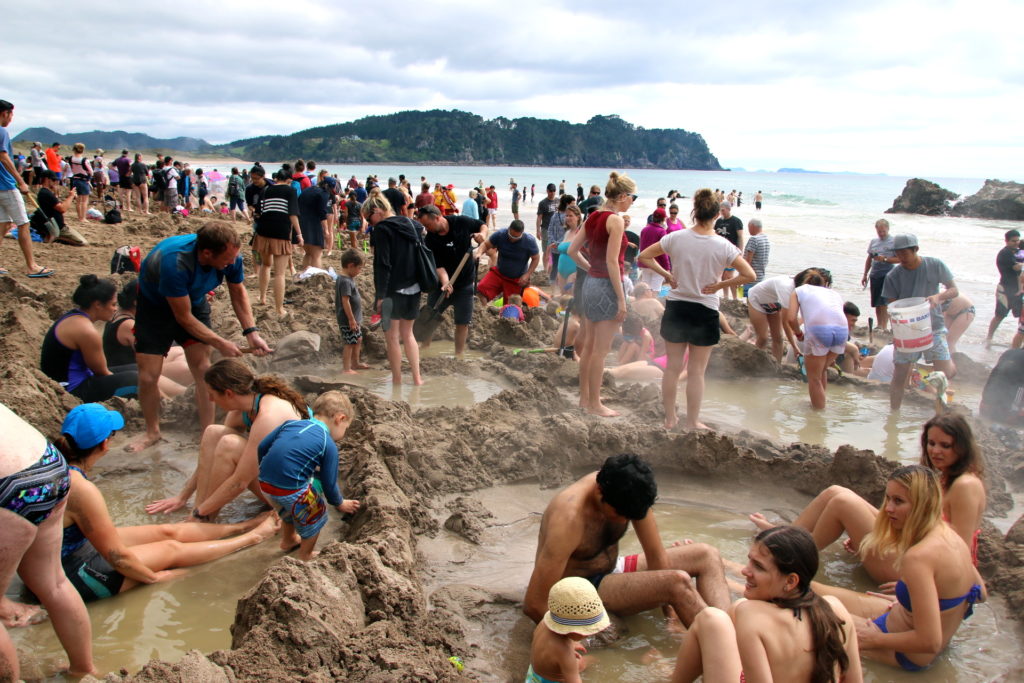 A 2h30-3h de route depuis Hamilton, nous voici arrivés à Whitianga. C’est notre point de départ pour visiter la péninsule de Coromandel. Nous y sommes restés 2 jours mais en prenant votre temps vous pouvez y consacrer 3 jours. Première étape, la célèbre Hot water beach! Elle s’avère exceptionnelle car c’est l’unique plage où vous pouvez accéder à une zone sablonneuse, au milieu de la plage, où les eaux sont juste bouillantes! Le principe est d’apporter une pelle, d’y faire un trou et de barboter la dedans! Il faut s’y rendre en marrée basse (les auberges vous indiqueront les heures idéales pour vous y rendre) et un petit conseil non négligeable… allez y le plus tôt possible!!! Pourquoi? car nous avons été très déçus de l’endroit! Imaginez une plage avec une petite zone d’eau chaude et dans cette zone, 300 personnes! Oui oui vous avez bien lu.. nous étions entourés, un dimanche, de kiwis et de touristes principalement asiatiques, juste l’horreur! Aucune place de disponible, des trous remplis par des familles, des amis bref très grosse déception pour ce lieu ultra touristique!